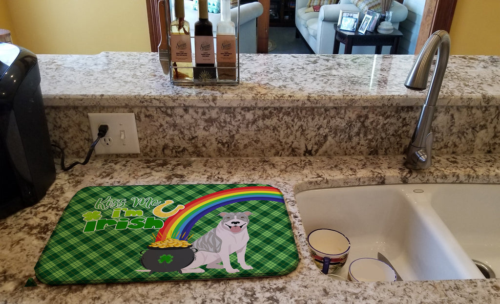 Shown here is the Blue Brindle Pit Bull Terrier St. Patrick's Day Dish Drying Mat from Caroline's Treasures featuring artwork of a Pit Bull Terrier in a St Patrick's Day design. The detailed illustration and vibrant colors make it a standout accent for your home. Say goodbye to messy countertops and soggy dish towels with our innovative dish drying mat. Our high-quality dish drying pad is designed to keep your countertops dry while offering a stylish and efficient solution. Whether you're air drying dishes, glasses, stemware, silverware, pots, pans, bottles, or even fruits and vegetables, our dish mat is the perfect choice. The 14 inches x 22 inches size fits most counters and dish drying racks, and the non-slip design ensures stability. Made with water-absorbent polyester and a polyurethane foam insert, our dish drying mat is not only functional but also durable. It's machine washable and printed in the USA for long-lasting use. The beautiful artwork adds flair to your kitchen decor, making it a perfect housewarming gift or present for any occasion. Upgrade your kitchen experience with our absorbent and versatile dish drying mat. Pit Bull Terriers are muscular dogs with confident posture. Their appearance reflects strength and loyalty. Perfect for: Kitchen counters and sinks, everyday dish drying and countertop protection, Dogs-themed homes, or year-round use for Pit Bull Terrier lovers. Makes a heartfelt gift for: Pit Bull Terrier owners, Dogs lovers, St Patrick's Day gifts, pet parents, friends who adore their Pit Bull Terrier, or anyone celebrating Dogs.