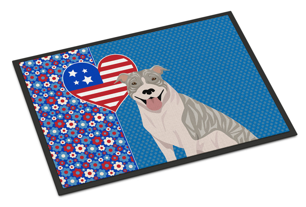 Shown here is the Blue Brindle Pit Bull Terrier USA American Doormat from Caroline's Treasures featuring artwork of a Pit Bull Terrier in a 4th of July design. The detailed illustration and vibrant colors make it a standout accent that celebrates both seasonal style for your homet. Celebrate love for country and home with our USA Love America Collection. Featuring patriotic designs inspired by red, white, and blue traditions, this collection brings heartfelt American spirit and timeless style to home d�cor and meaningful gifts. Welcome your guests in style with our Artwork Door Mat, designed to withstand almost any weather condition. This mat, measuring approximately 24 by 36 inches, is held together by durable black binding tape. Its top layer, composed of polyester felt, is dyed with the eye-catching image you see on the mat. A few layers below provide the mat with stability, while its rubber bottom is stamped to help prevent slipping and ensures safety. Our mat works wonderfully as both an indoor or outdoor door mat. For cleaning, simply hose it off with water or use a power washer - no need for any cleaner that produces suds. Avoid scrubbing with a brush, instead, opt for the vacuum on floor setting. Designed manufactured and printed in the USA, this mat is a perfect addition to your porch, outdoor kitchen, entryway, or any indoor space. Its unique design makes it a charming decorative rug that greets your guests and adds a stylish touch to your home decor. Pit Bull Terriers are muscular dogs with confident posture. Their appearance reflects strength and loyalty. Perfect for: Front doors, entryways, and porches, everyday home d�cor, Dogs-themed homes, or year-round display for Pit Bull Terrier lovers. Makes a heartfelt gift for: Pit Bull Terrier owners, Dogs lovers, 4th of July gifts, pet parents, friends who adore their Pit Bull Terrier, or anyone celebrating Dogs.