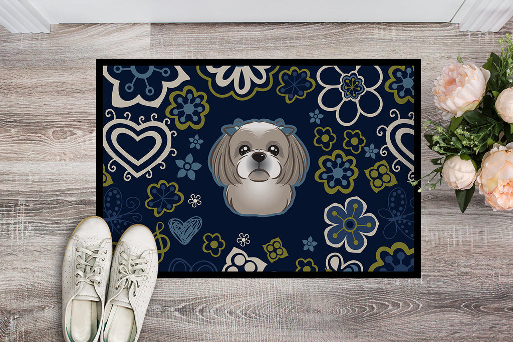 Blue Flowers Gray Silver Shih Tzu Doormat - 24x36 Decorative Floor Mat – Indoor/Outdoor Rug with Artistic Flair BB5101JMAT