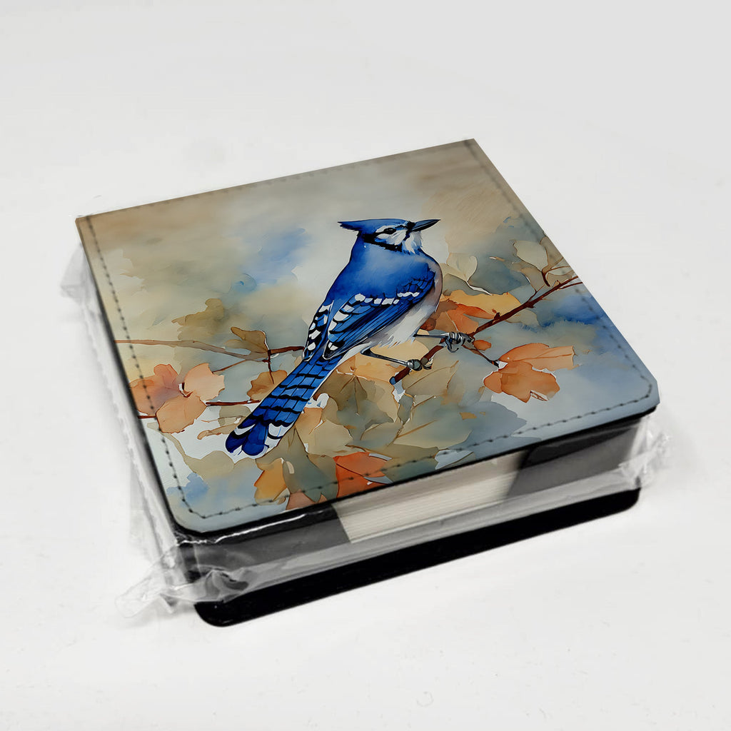 PU Leather Note Paper Holder featuring breed specific Blue Jay artwork. Elevate your workspace with this PU Leather Note Paper Holder, crafted to resemble luxurious leather without the use of animal products. Made from durable synthetic PU leather, it offers both a premium look and eco-friendly appeal. This note holder, compactly sized at 4.25 x 4.25 x 1.25 inches, includes about 160 sheets of 3.75 x 3.75-inch note paper—ideal for quick notes and reminders. An exclusive artist-designed cover makes each holder uniquely vibrant, adding a splash of color and personality to any desk or office. The discrete design keeps note paper hidden, maintaining a neat and organized workspace. Perfect as a gift or for personal use, this stylish holder is refillable with standard paper, ensuring long-lasting utility. A must-have for anyone seeking a sophisticated, artful touch to their workspace while supporting animal-friendly products. Add style, organization, and creativity to your everyday routine with this elegant note paper holder.