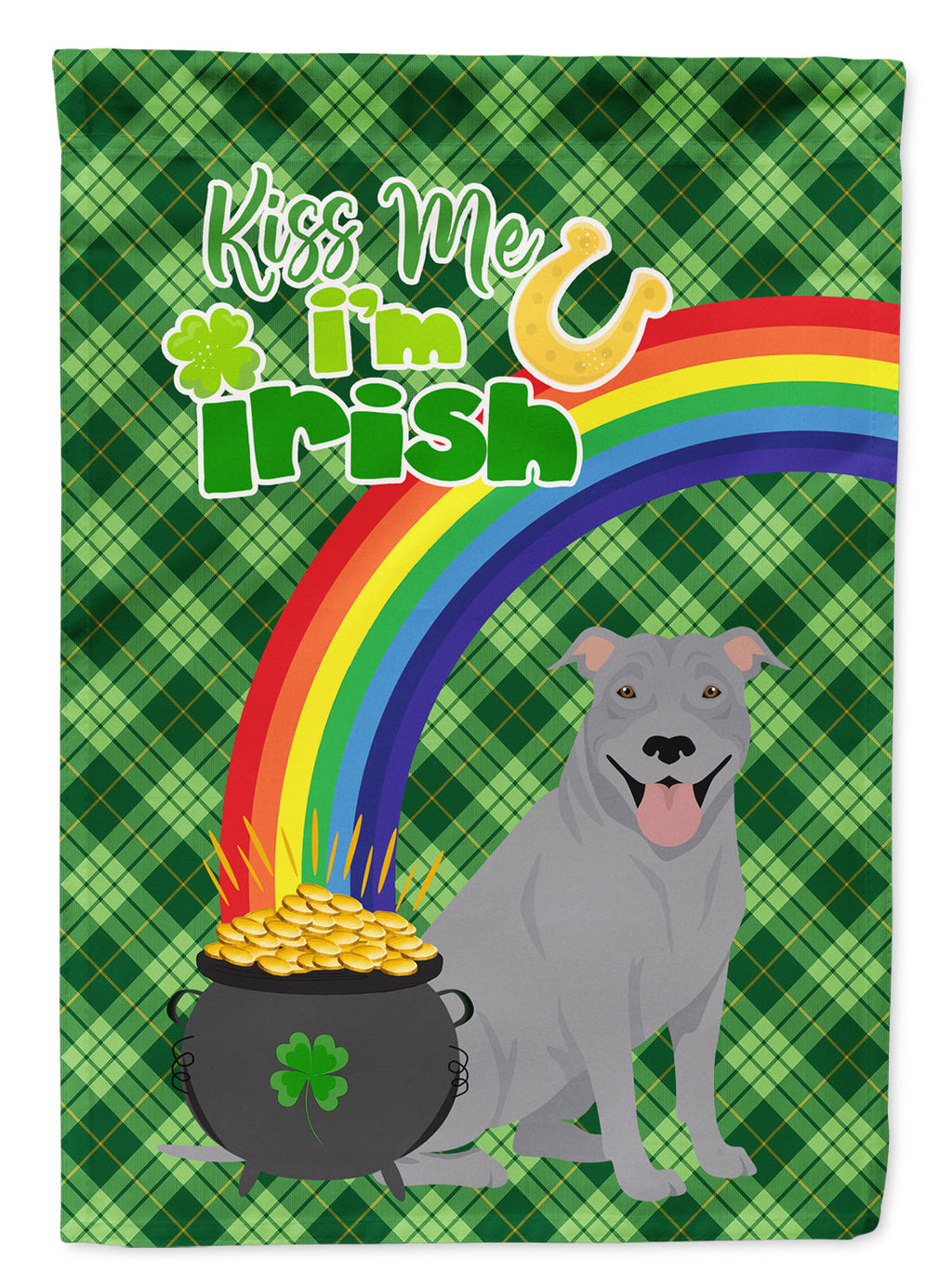 Blue Pit Bull Terrier St. Patrick's Garden Flag – "Kiss Me I’m Irish" with Pot of Gold & Rainbow