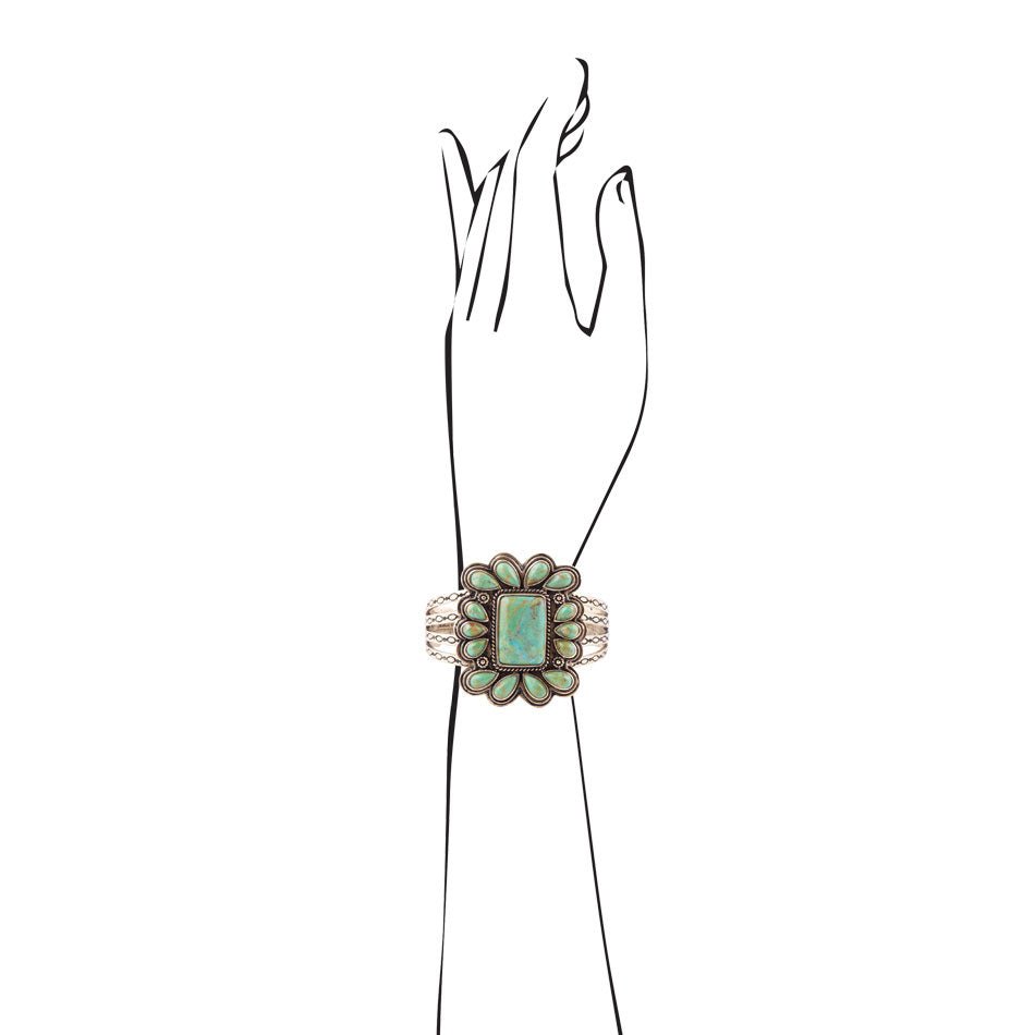 This bracelet boasts stunning genuine bronze and turquoise, designed to fit most wrists with a 2.5" inner diameter for a comfortable and chic look. The top of the bracelet measures 2" x 1.75", beautifully showcasing its intricate details. With a weight of 49.35 grams, this piece is both bold and lightweight.