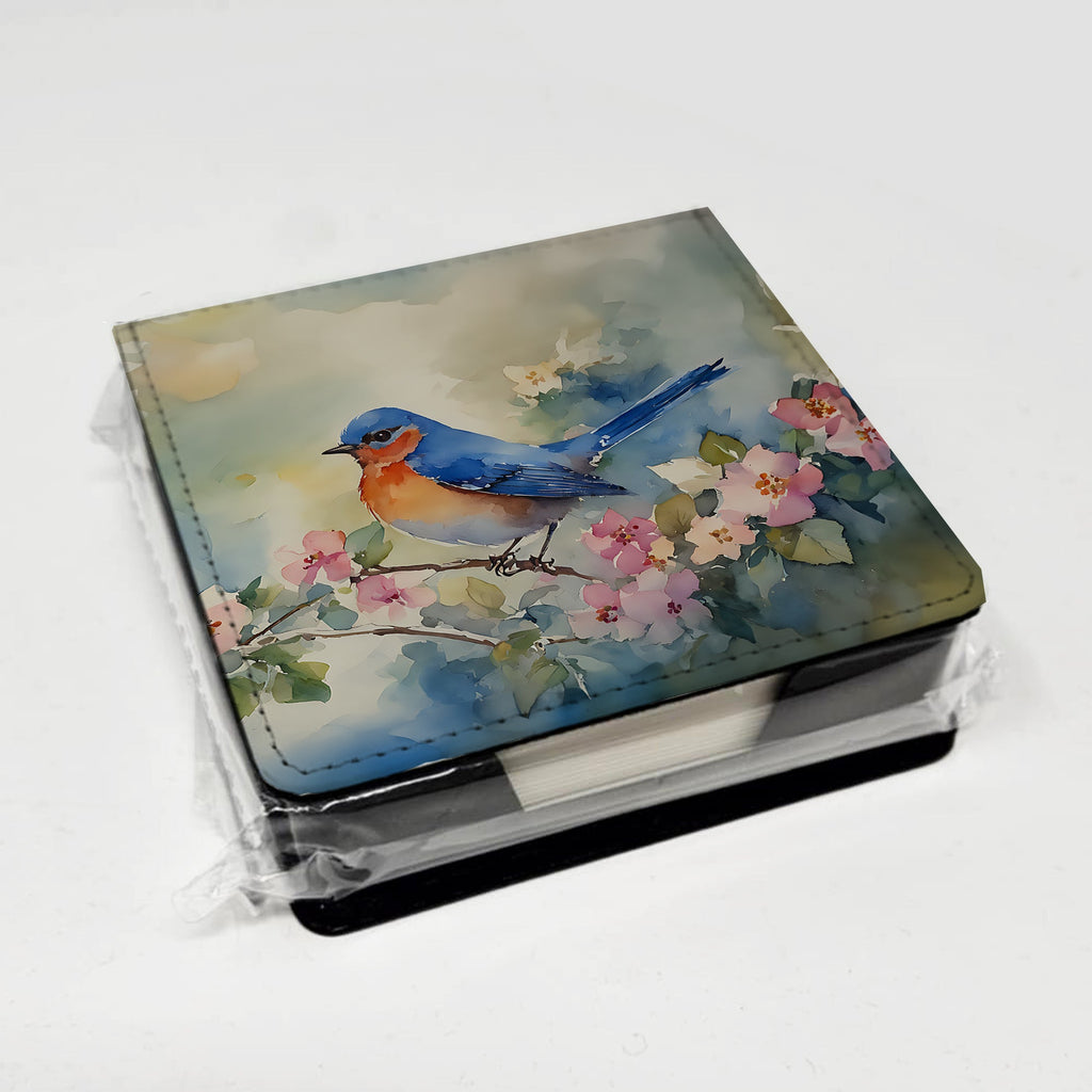 PU Leather Note Paper Holder featuring breed specific Bluebird artwork. Elevate your workspace with this PU Leather Note Paper Holder, crafted to resemble luxurious leather without the use of animal products. Made from durable synthetic PU leather, it offers both a premium look and eco-friendly appeal. This note holder, compactly sized at 4.25 x 4.25 x 1.25 inches, includes about 160 sheets of 3.75 x 3.75-inch note paper—ideal for quick notes and reminders. An exclusive artist-designed cover makes each holder uniquely vibrant, adding a splash of color and personality to any desk or office. The discrete design keeps note paper hidden, maintaining a neat and organized workspace. Perfect as a gift or for personal use, this stylish holder is refillable with standard paper, ensuring long-lasting utility. A must-have for anyone seeking a sophisticated, artful touch to their workspace while supporting animal-friendly products. Add style, organization, and creativity to your everyday routine with this elegant note paper holder.