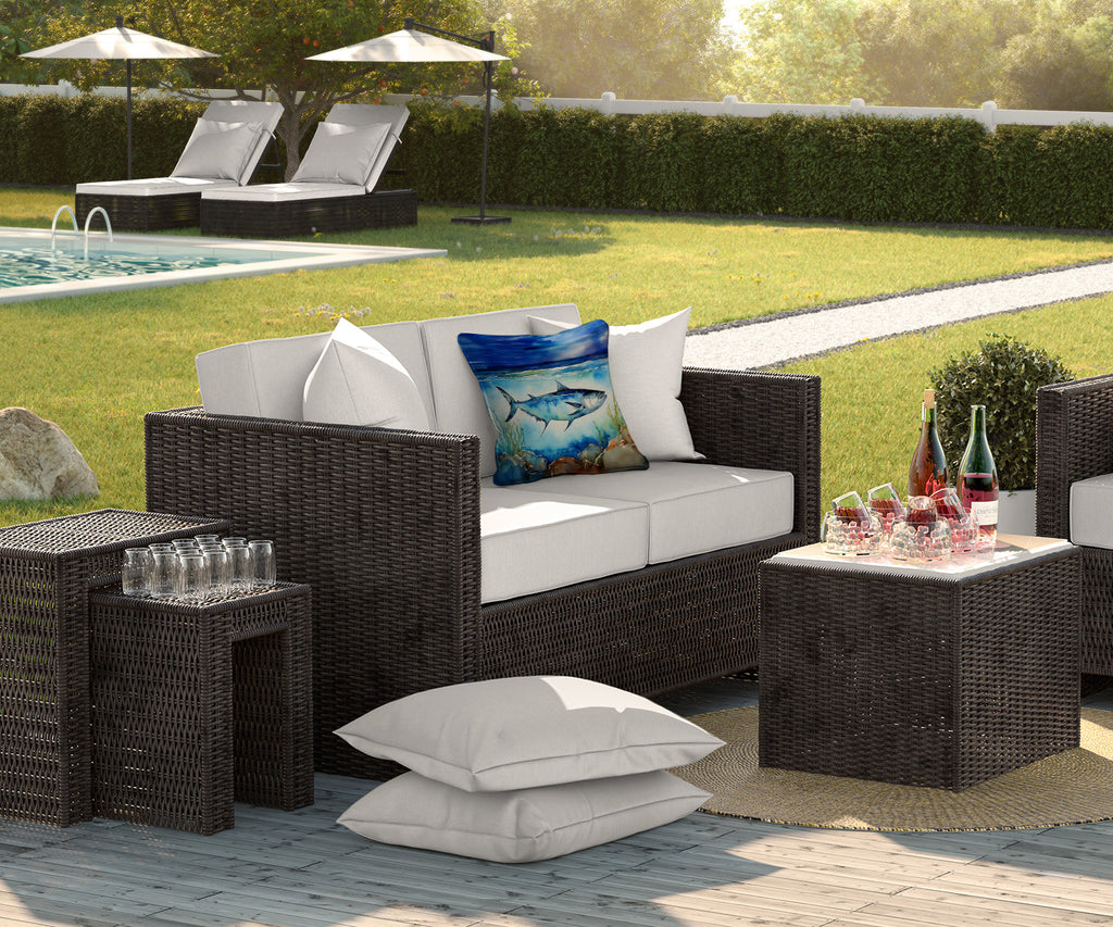 Decorate your space with our  Bluefin Tuna artwork on a Pillow. Revitalize your outdoor or indoor living space with Caroline's Treasures 18x18 Fabric Decorative Pillow. With a generously sized dimension of approximately 18 inches by 18 inches, this pillow makes a comfortable and aesthetic addition to any seating area. Made from a unique, water-resistant material developed by Caroline's Treasures, the pillow sham is 100% polyester fabric that's durable and ready to weather any condition. Its vibrant, full-color artwork will not fade over time as it is dyed with color-fast dyes. Whether you place it on your patio furniture, porch, veranda, or indoor couch, its soft canvas fabric ensures a cozy experience. The pillow is handcrafted in the United States, featuring a sham created from three pieces of fabric and a polyester insert for enduring shape and overstuffed comfort. Despite being robustly built to endure the outdoors, it is as soft and snug as your favorite indoor cushions. Please note, as all our pillows are handmade, sizes may vary slightly, adding to the charm of this unique decorative item.