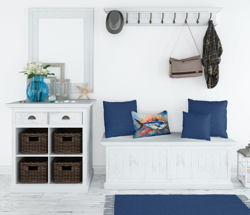 Decorate your space with our  Bluefin Tuna artwork on a Pillow. Embrace the fusion of comfort and style with Caroline's Treasures Fabric Decorative Pillow. This 12x16 inch outdoor pillow is designed to complement your patio furniture, adding a splash of color and artistry to your outdoor setting. Constructed with a 100% Polyester Fabric pillow sham filled with a plush pillow form, this cushion is as comfortable as it is durable. Our outdoor pillow utilizes a novel fabric, meticulously woven for enhanced water resistance. This soft canvas material is equally suited for your indoor couch as well as outdoor settings such as the patio, porch, or veranda. To ensure enduring vibrance, we employ colorfast dyes resistant to fading even when subjected to weather elements. The making of this pillow involves the delicate sewing together of three fabric pieces to create a sham, into which a polyester insert is carefully placed. The result is an overstuffed pillow that tenaciously holds its shape. With both the sham and the pillow insert crafted in the United States, these handmade pillows are a testament to superior local craftsmanship. Note that as these pillows are handmade, sizes may slightly vary, enhancing their unique appeal. Enjoy comfort in style with Caroline's Treasures Fabric Decorative Pillow.