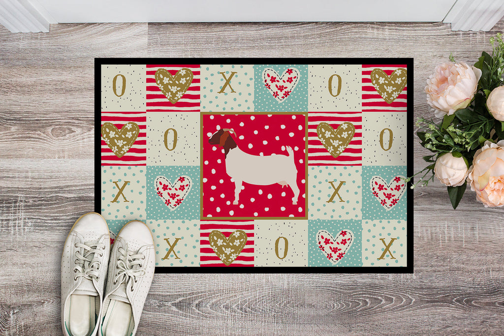 Decorate your space with our Valentine's Day Boer Goat artwork on a Doormat. Welcome your guests in style with our Artwork Door Mat, designed to withstand almost any weather condition. This mat, measuring approximately 18 by 27 inches, is held together by durable black binding tape. Its top layer, composed of polyester felt, is dyed with the eye-catching image you see on the mat. A few layers below provide the mat with stability, while its rubber bottom is stamped to help prevent slipping and ensures safety. Our mat works wonderfully as both an indoor or outdoor door mat. For cleaning, simply hose it off with water or use a power washer - no need for any cleaner that produces suds. Avoid scrubbing with a brush, instead, opt for the vacuum on floor setting. Designed manufactured and printed in the USA, this mat is a perfect addition to your porch, outdoor kitchen, entryway, or any indoor space. Its unique design makes it a charming decorative rug that greets your guests and adds a stylish touch to your home decor.