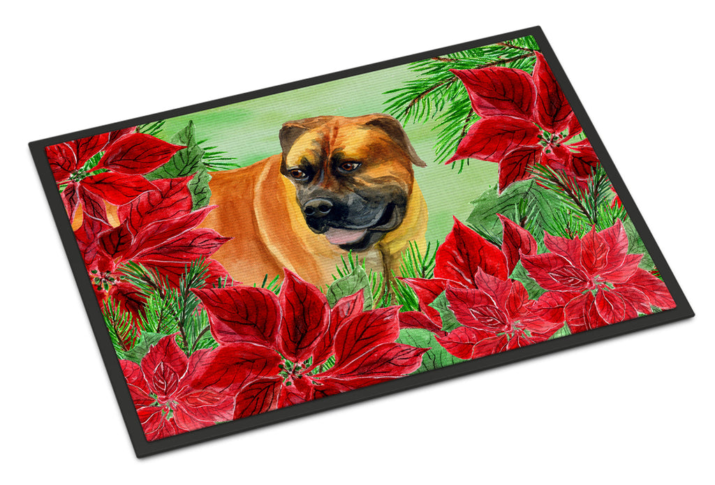 Decorate your space with our Mastiff artwork on a Doormat. Welcome your guests in style with our Artwork Door Mat, designed to withstand almost any weather condition. This mat, measuring approximately 24 by 36 inches, is held together by durable black binding tape. Its top layer, composed of polyester felt, is dyed with the eye-catching image you see on the mat. A few layers below provide the mat with stability, while its rubber bottom is stamped to help prevent slipping and ensures safety. Our mat works wonderfully as both an indoor or outdoor door mat. For cleaning, simply hose it off with water or use a power washer - no need for any cleaner that produces suds. Avoid scrubbing with a brush, instead, opt for the vacuum on floor setting. Designed manufactured and printed in the USA, this mat is a perfect addition to your porch, outdoor kitchen, entryway, or any indoor space. Its unique design makes it a charming decorative rug that greets your guests and adds a stylish touch to your home decor.