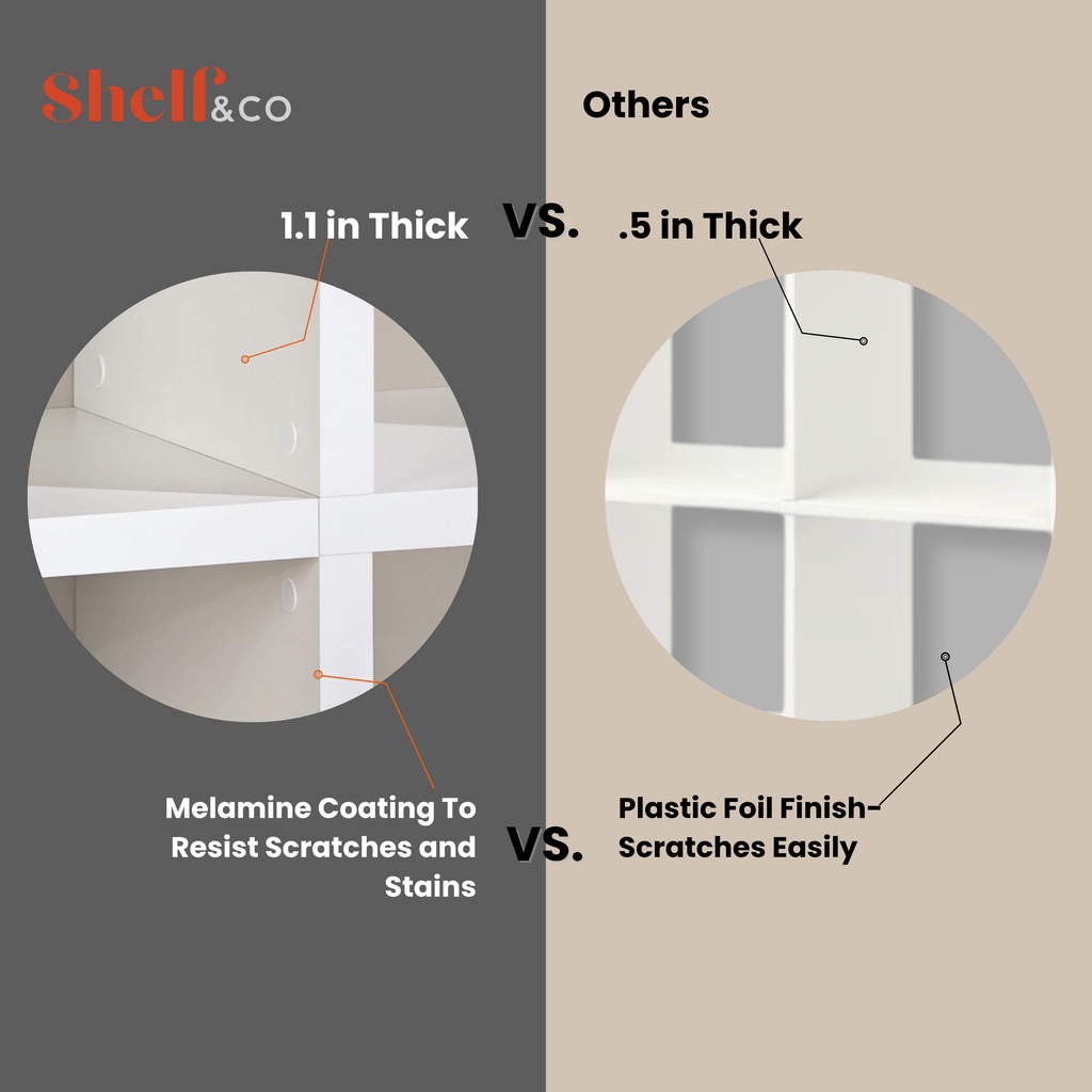 Maximize your organization with the 9 cube storage unit, crafted for strength, flexibility, and modern appeal. Each shelf board is over 1 inch thick, offering a sturdier construction than standard options. The high quality melamine finish delivers a clean, contemporary look and a scratch-resistant surface.