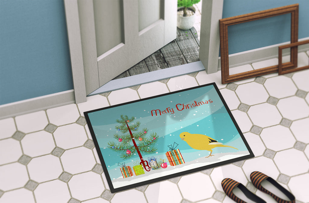Decorate your space with our Christmas Border Canary artwork on a Doormat. Welcome your guests in style with our Artwork Door Mat, designed to withstand almost any weather condition. This mat, measuring approximately 24 by 36 inches, is held together by durable black binding tape. Its top layer, composed of polyester felt, is dyed with the eye-catching image you see on the mat. A few layers below provide the mat with stability, while its rubber bottom is stamped to help prevent slipping and ensures safety. Our mat works wonderfully as both an indoor or outdoor door mat. For cleaning, simply hose it off with water or use a power washer - no need for any cleaner that produces suds. Avoid scrubbing with a brush, instead, opt for the vacuum on floor setting. Designed manufactured and printed in the USA, this mat is a perfect addition to your porch, outdoor kitchen, entryway, or any indoor space. Its unique design makes it a charming decorative rug that greets your guests and adds a stylish touch to your home decor.