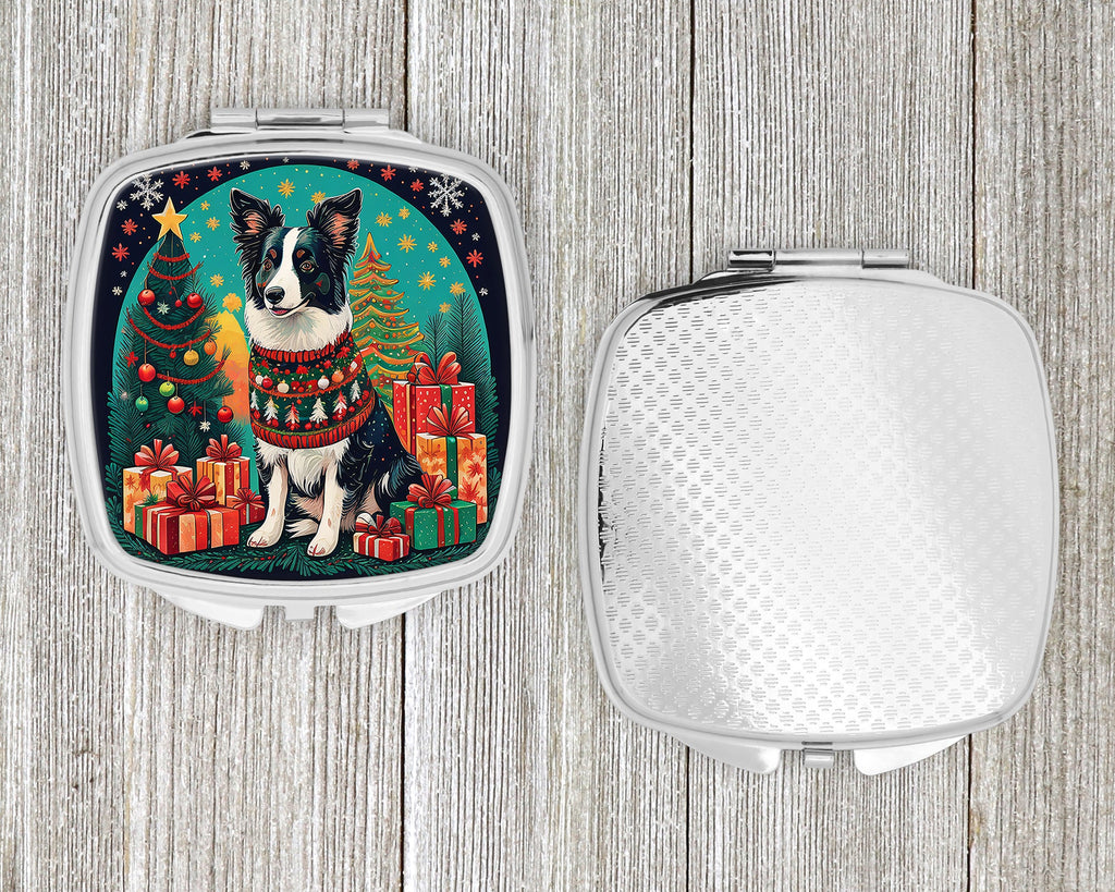 Decorate your space with our Christmas Border Collie artwork on a Compact Mirror. Introducing our Square Compact Mirror, a blend of elegance, functionality, and compactness, perfect for on-the-go touch-ups. This Silvertone metal mirror, with dimensions of 2.75 inches x 3 inches x .3 inches, fits effortlessly into your purse, handbag, or pocket, ensuring that you can check your appearance anytime, anywhere. Our compact mirror stands out with its eye-catching artwork on the front, adding a dash of style to this practical accessory. It is more than just a mirror; it's a statement piece that reflects your personality and aesthetic. When opened, this compact reveals two mirrors inside, doubling your perspective for precise touch-ups. The Silvertone metal construction ensures durability while maintaining a lightweight feel, making it an ideal everyday carry item. Whether you're rushing to a meeting, prepping for a dinner date, or just need a quick check on your look, our Square Compact Mirror is your reliable companion. Experience the perfect blend of style and practicality with this must-have accessory.