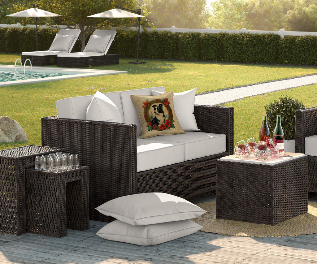 Decorate your space with our Christmas Border Collie artwork on a Pillow. Bring a bit of Winter into your home with a Winter Pillow. Revitalize your outdoor or indoor living space with Caroline's Treasures 18x18 Fabric Decorative Pillow. With a generously sized dimension of approximately 18 inches by 18 inches, this pillow makes a comfortable and aesthetic addition to any seating area. Made from a unique, water-resistant material developed by Caroline's Treasures, the pillow sham is 100% polyester fabric that's durable and ready to weather any condition. Its vibrant, full-color artwork will not fade over time as it is dyed with color-fast dyes. Whether you place it on your patio furniture, porch, veranda, or indoor couch, its soft canvas fabric ensures a cozy experience. The pillow is handcrafted in the United States, featuring a sham created from three pieces of fabric and a polyester insert for enduring shape and overstuffed comfort. Despite being robustly built to endure the outdoors, it is as soft and snug as your favorite indoor cushions. Please note, as all our pillows are handmade, sizes may vary slightly, adding to the charm of this unique decorative item.