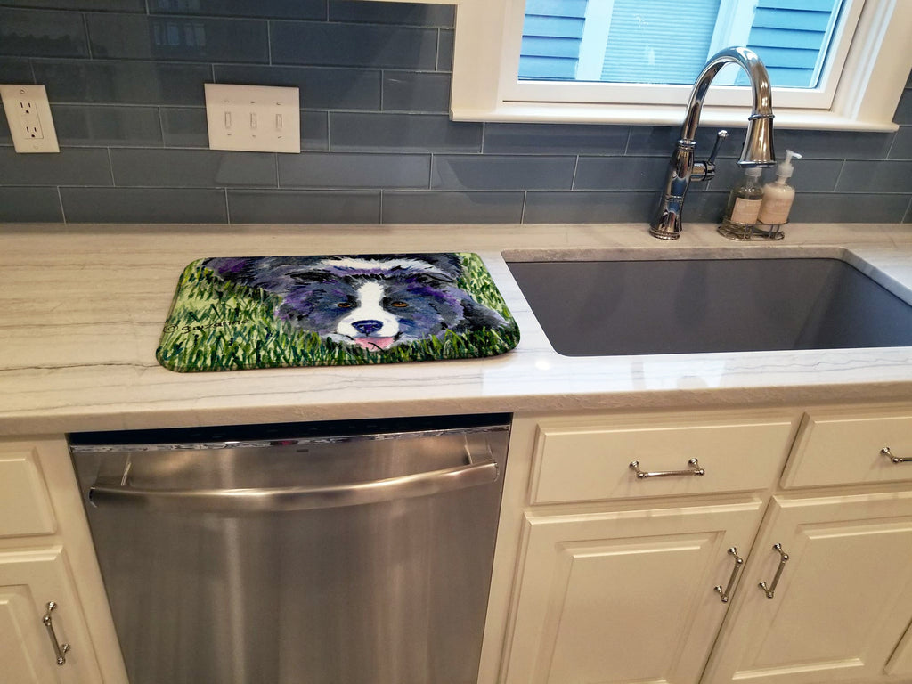 Decorate your space with our Border Collie artwork on a Dish Drying Mat. Say goodbye to messy countertops and soggy dish towels with our innovative dish drying mat. Our high-quality dish drying pad is designed to keep your countertops dry while offering a stylish and efficient solution. Whether you're air drying dishes, glasses, stemware, silverware, pots, pans, bottles, or even fruits and vegetables, our dish mat is the perfect choice. The 14 inches x 22 inches size fits most counters and dish drying racks, and the non-slip design ensures stability. Made with water-absorbent polyester and a polyurethane foam insert, our dish drying mat is not only functional but also durable. It's machine washable and printed in the USA for long-lasting use. The beautiful artwork adds flair to your kitchen decor, making it a perfect housewarming gift or present for any occasion. Upgrade your kitchen experience with our absorbent and versatile dish drying mat.