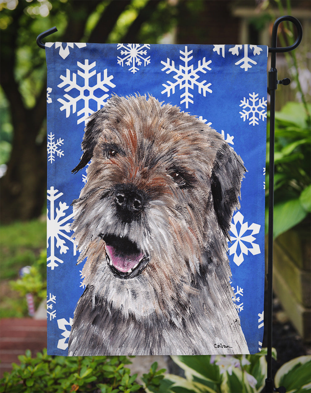 Decorate your space with our Christmas Border Terrier artwork on a Garden Flag. Bring a bit of Winter into your home with a Winter Garden Flag. Enhance the beauty of your garden, patio, or yard with Caroline's Treasures Decorative Garden Flag, proudly made in the USA. Crafted from two pieces of thick, double-sided polyester fabric, this 2-ply garden flag is designed to withstand various weather conditions, making it water-resistant and weatherproof. Featuring correctly readable words on both sides, this garden flag offers a delightful visual experience from any angle. With its heavier weight, it stands out among other garden flags, ensuring stability and durability even in wind, rain, and snow. Measuring approximately 11 1/4 inches by 15 1/2 inches, this flag allows you to personalize your outdoor decor. It comes with a 1 1/2-inch sleeve sewn in, allowing easy attachment to any standard garden flag stand or garden size porch hanger (sold separately). Make a statement in your outdoor space with Caroline's Treasures Decorative Garden Flag, a vibrant and high-quality flag that adds color and personality to your surroundings. Proudly made in the USA, it's a symbol of quality craftsmanship and attention to detail.