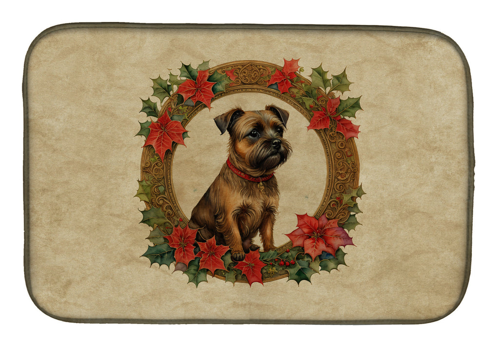 Dish Drying Mat featuring breed specific Border Terrier artwork. Celebrate Christmas with this Christmas Dish Drying Mat. Say goodbye to messy countertops and soggy dish towels with our innovative dish drying mat. Our high-quality dish drying pad is designed to keep your countertops dry while offering a stylish and efficient solution. Whether you're air drying dishes, glasses, stemware, silverware, pots, pans, bottles, or even fruits and vegetables, our dish mat is the perfect choice. The 14 inches x 22 inches size fits most counters and dish drying racks, and the non-slip design ensures stability. Made with water-absorbent polyester and a polyurethane foam insert, our dish drying mat is not only functional but also durable. It's machine washable and printed in the USA for long-lasting use. The beautiful artwork adds flair to your kitchen decor, making it a perfect housewarming gift or present for any occasion. Upgrade your kitchen experience with our absorbent and versatile dish drying mat.
