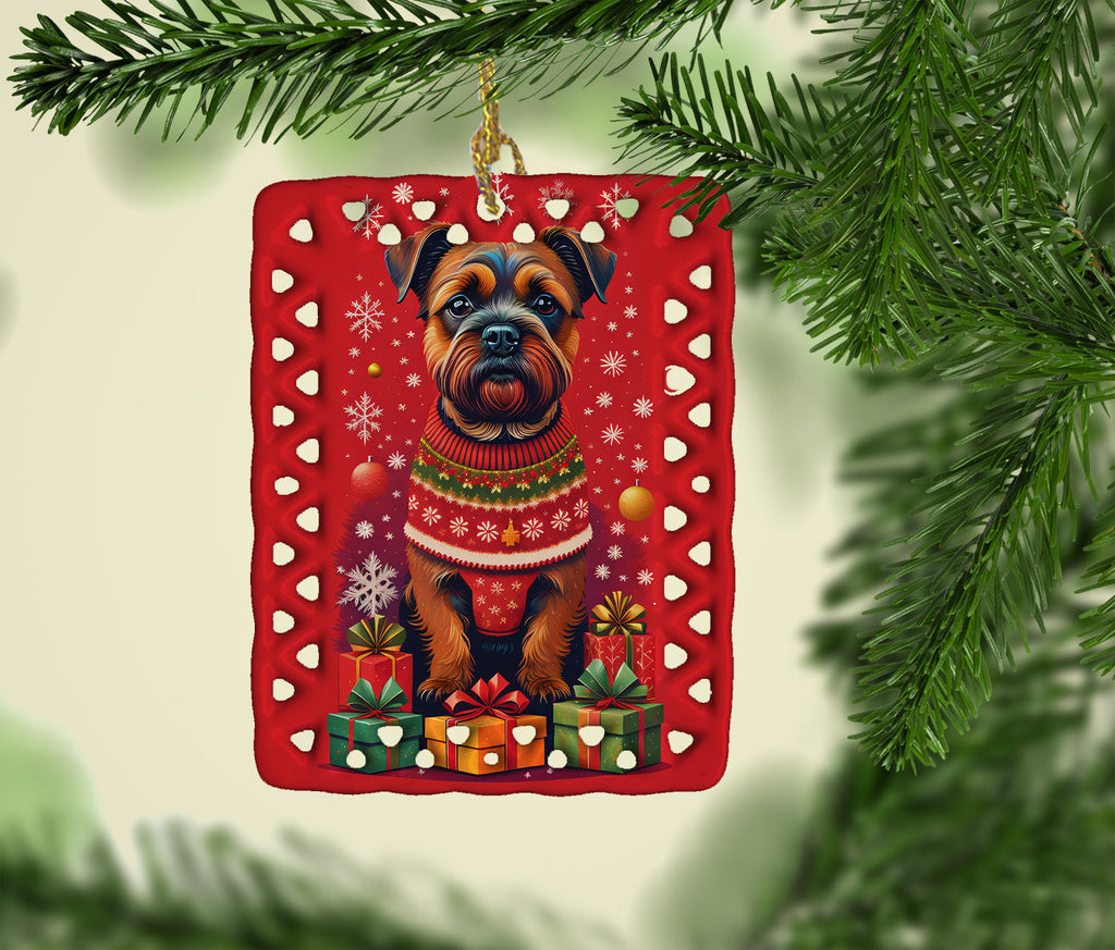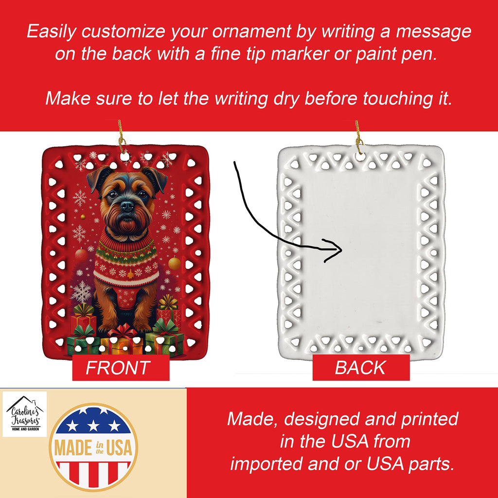 Porcelain Ornament featuring breed specific Border Terrier artwork. Celebrate Christmas with this Christmas Ornament. Add a unique, personal touch to your holiday decor with our Rectangular Lattice Porcelain Ornament. Perfect for creating cherished memories, this high-quality ornament shines under festive lights, reflecting warmth and joy throughout your Christmas tree. Crafted with a glossy finish, it showcases vibrant, full-color artwork contributed by our talented artists, ensuring your tree is adorned with a burst of color and holiday spirit. What sets this Porcelain Ornament apart is its customizable white back. Use a paint pen or permanent marker to write a heartfelt message, commemorate a special year, or mark an unforgettable date, turning this ornament into a keepsake that will be treasured for years to come. For best results, allow any personalization to dry thoroughly before handling. Each ornament comes complete with a delicate gold cord, making it easy to hang and display. Proudly made in the USA, this ornament measures 3.375 x 2.625 inches and is a thoughtful gift for pet sitters, teachers, family members, or anyone who would appreciate a little extra holiday magic. Bring style, charm, and a touch of personal meaning to your Christmas tree with this beautifully designed ornament..