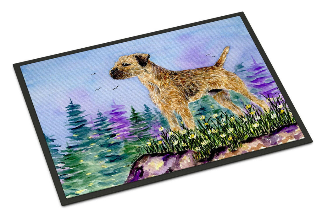 Decorate your space with our Border Terrier artwork on a Doormat. Welcome your guests in style with our Artwork Door Mat, designed to withstand almost any weather condition. This mat, measuring approximately 18 by 27 inches, is held together by durable black binding tape. Its top layer, composed of polyester felt, is dyed with the eye-catching image you see on the mat. A few layers below provide the mat with stability, while its rubber bottom is stamped to help prevent slipping and ensures safety. Our mat works wonderfully as both an indoor or outdoor door mat. For cleaning, simply hose it off with water or use a power washer - no need for any cleaner that produces suds. Avoid scrubbing with a brush, instead, opt for the vacuum on floor setting. Designed manufactured and printed in the USA, this mat is a perfect addition to your porch, outdoor kitchen, entryway, or any indoor space. Its unique design makes it a charming decorative rug that greets your guests and adds a stylish touch to your home decor.