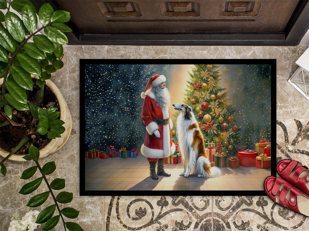 Decorate your space with our Christmas Borzoi Russian Wolfhound artwork on a Doormat. Welcome your guests in style with our Artwork Door Mat, designed to withstand almost any weather condition. This mat, measuring approximately 24 by 36 inches, is held together by durable black binding tape. Its top layer, composed of polyester felt, is dyed with the eye-catching image you see on the mat. A few layers below provide the mat with stability, while its rubber bottom is stamped to help prevent slipping and ensures safety. Our mat works wonderfully as both an indoor or outdoor door mat. For cleaning, simply hose it off with water or use a power washer - no need for any cleaner that produces suds. Avoid scrubbing with a brush, instead, opt for the vacuum on floor setting. Designed manufactured and printed in the USA, this mat is a perfect addition to your porch, outdoor kitchen, entryway, or any indoor space. Its unique design makes it a charming decorative rug that greets your guests and adds a stylish touch to your home decor.
