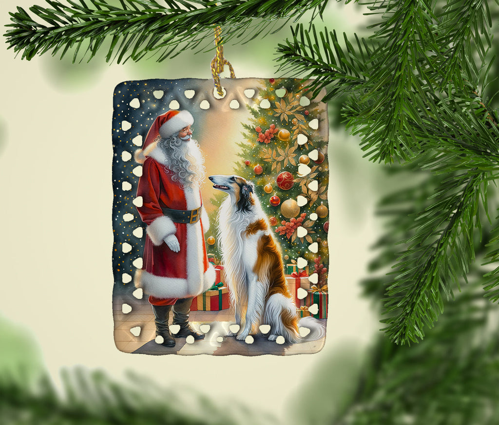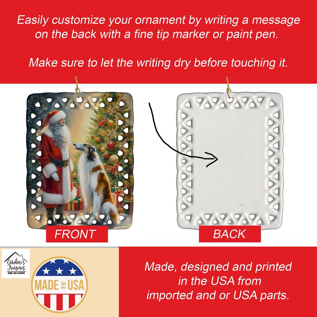 Porcelain Ornament featuring breed specific Borzoi Russian Wolfhound artwork. Celebrate Christmas with this Christmas Ornament. Add a unique, personal touch to your holiday decor with our Rectangular Lattice Porcelain Ornament. Perfect for creating cherished memories, this high-quality ornament shines under festive lights, reflecting warmth and joy throughout your Christmas tree. Crafted with a glossy finish, it showcases vibrant, full-color artwork contributed by our talented artists, ensuring your tree is adorned with a burst of color and holiday spirit. What sets this Porcelain Ornament apart is its customizable white back. Use a paint pen or permanent marker to write a heartfelt message, commemorate a special year, or mark an unforgettable date, turning this ornament into a keepsake that will be treasured for years to come. For best results, allow any personalization to dry thoroughly before handling. Each ornament comes complete with a delicate gold cord, making it easy to hang and display. Proudly made in the USA, this ornament measures 3.375 x 2.625 inches and is a thoughtful gift for pet sitters, teachers, family members, or anyone who would appreciate a little extra holiday magic. Bring style, charm, and a touch of personal meaning to your Christmas tree with this beautifully designed ornament..
