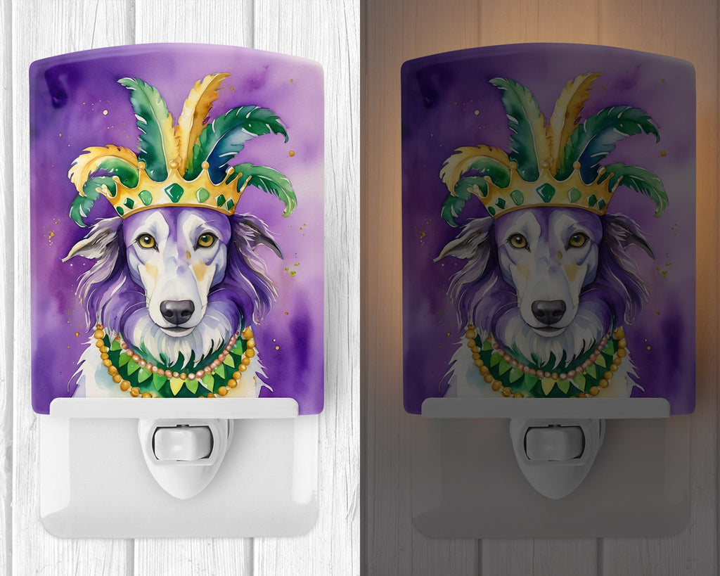 Decorate your space with our Mardi Gras Borzoi Russian Wolfhound artwork on a Night Light. Introduce a splash of artistic flair and subtle illumination to your space with the Decorative Ceramic Night Light from Caroline's Treasures. Perfect for any room, this night light seamlessly blends functionality with an aesthetic appeal, offering a stylish solution to brighten up dark corners of your home or office. Boasting a six-inch high by four-inch wide ceramic tile at the front, it showcases vivid, full-color artwork from distinguished artists, transforming a simple utility into a vibrant art piece. The artwork is securely encased in a robust metal holder, ensuring durability and longevity. Two screws are provided to firmly affix the tile into the holder. The holder extends three inches deep, housing an included bulb that emits a soft, welcoming glow. This product meets all safety standards, as evidenced by its UL approval. Proudly made in the United States from imported components, this Decorative Ceramic Night Light is not just a functional device; it's a statement piece that enhances the ambiance of your surroundings.