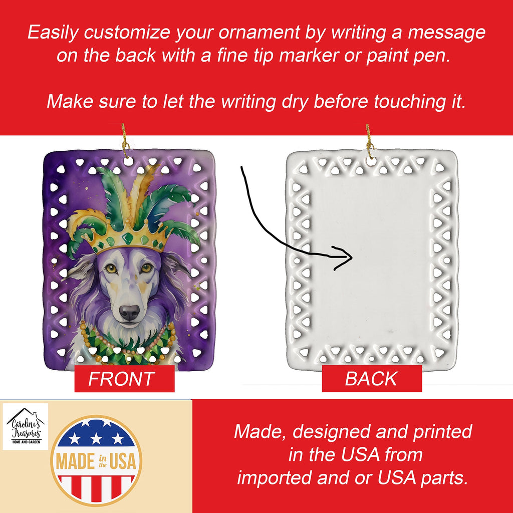 Porcelain Ornament featuring breed specific Borzoi Russian Wolfhound artwork. Celebrate Mardi Gras with this Mardi Gras Ornament. Add a unique, personal touch to your holiday decor with our Rectangular Lattice Porcelain Ornament. Perfect for creating cherished memories, this high-quality ornament shines under festive lights, reflecting warmth and joy throughout your Christmas tree. Crafted with a glossy finish, it showcases vibrant, full-color artwork contributed by our talented artists, ensuring your tree is adorned with a burst of color and holiday spirit. What sets this Porcelain Ornament apart is its customizable white back. Use a paint pen or permanent marker to write a heartfelt message, commemorate a special year, or mark an unforgettable date, turning this ornament into a keepsake that will be treasured for years to come. For best results, allow any personalization to dry thoroughly before handling. Each ornament comes complete with a delicate gold cord, making it easy to hang and display. Proudly made in the USA, this ornament measures 3.375 x 2.625 inches and is a thoughtful gift for pet sitters, teachers, family members, or anyone who would appreciate a little extra holiday magic. Bring style, charm, and a touch of personal meaning to your Christmas tree with this beautifully designed ornament..
