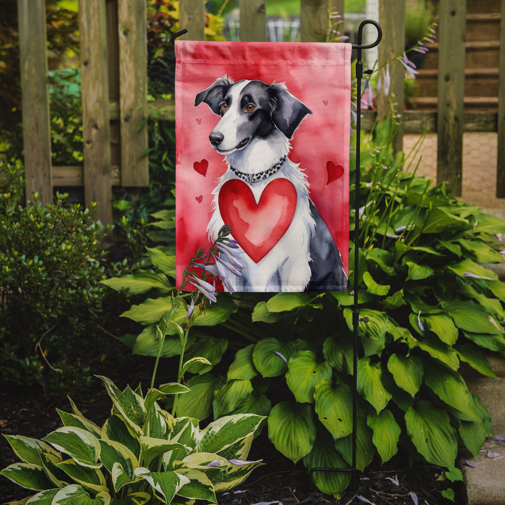 Decorate your space with our Valentine's Day Borzoi Russian Wolfhound artwork on a Garden Flag. Enhance the beauty of your garden, patio, or yard with Caroline's Treasures Decorative Garden Flag, proudly made in the USA. Crafted from two pieces of thick, double-sided polyester fabric, this 2-ply garden flag is designed to withstand various weather conditions, making it water-resistant and weatherproof. Featuring correctly readable words on both sides, this garden flag offers a delightful visual experience from any angle. With its heavier weight, it stands out among other garden flags, ensuring stability and durability even in wind, rain, and snow. Measuring approximately 11 1/4 inches by 15 1/2 inches, this flag allows you to personalize your outdoor decor. It comes with a 1 1/2-inch sleeve sewn in, allowing easy attachment to any standard garden flag stand or garden size porch hanger (sold separately). Make a statement in your outdoor space with Caroline's Treasures Decorative Garden Flag, a vibrant and high-quality flag that adds color and personality to your surroundings. Proudly made in the USA, it's a symbol of quality craftsmanship and attention to detail.