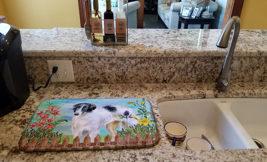 Decorate your space with our Borzoi/Russian Wolfhound artwork on a Dish Drying Mat. Bring a bit of Spring into your home with a Spring Dish Drying Mat. Say goodbye to messy countertops and soggy dish towels with our innovative dish drying mat. Our high-quality dish drying pad is designed to keep your countertops dry while offering a stylish and efficient solution. Whether you're air drying dishes, glasses, stemware, silverware, pots, pans, bottles, or even fruits and vegetables, our dish mat is the perfect choice. The 14 inches x 22 inches size fits most counters and dish drying racks, and the non-slip design ensures stability. Made with water-absorbent polyester and a polyurethane foam insert, our dish drying mat is not only functional but also durable. It's machine washable and printed in the USA for long-lasting use. The beautiful artwork adds flair to your kitchen decor, making it a perfect housewarming gift or present for any occasion. Upgrade your kitchen experience with our absorbent and versatile dish drying mat.