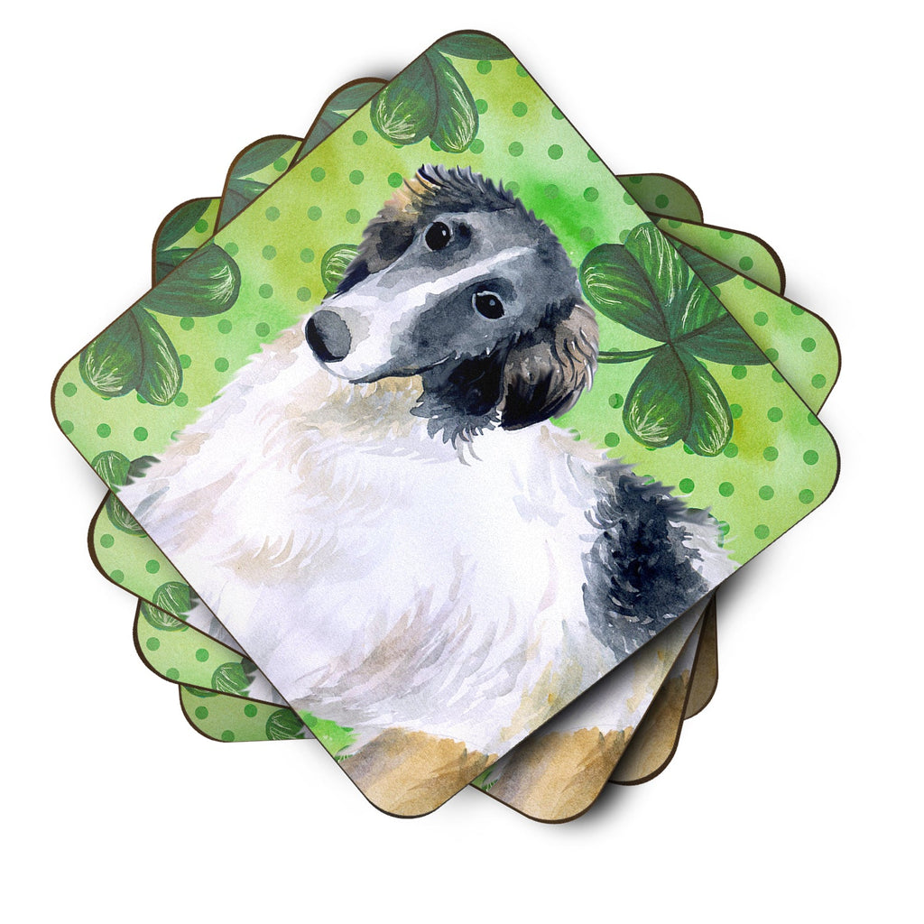 Decorate your space with our St Patrick's Day Borzoi/Russian Wolfhound artwork on a Coaster set. Presenting our Set of 4 Foam Coasters, a stylish and practical addition to your table setting. Each square coaster, measuring 3 1/2 inches by 3 1/2 inches, is perfectly sized to accommodate various drinkware, from coffee mugs to tumblers. These coasters stand out with their full-color artwork, permanently dyed onto the material for a vibrant and fade-resistant finish. They're not just functional, they're a fashionable statement, adding a touch of flair to any gathering or event. Our foam coasters serve a dual purpose - they protect your table from water stains and are perfect for both hot and cold drinks. The material used is similar to that of our high-quality mouse pads, ensuring durability and heat resistance. These coasters are easy to maintain - simply wash them in the top of your dishwasher and lay flat to dry. The design won't come off, ensuring they retain their vivid colors for years. Pair them with one of our insulated coolers or huggers for a cohesive, thoughtful gift set. Enhance your beverage experience with our Set of 4 Foam Coasters.