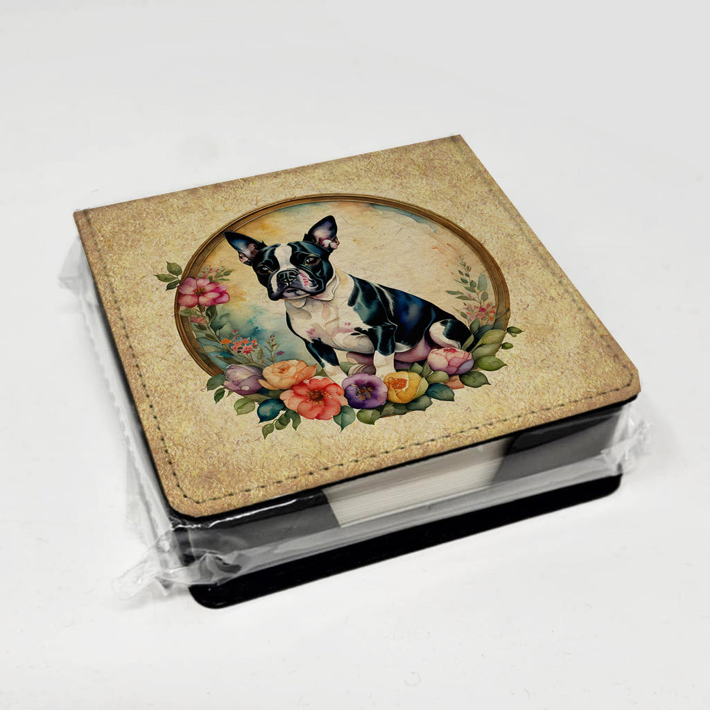 PU Leather Note Paper Holder featuring breed specific Boston Terrier artwork. Elevate your workspace with this PU Leather Note Paper Holder, crafted to resemble luxurious leather without the use of animal products. Made from durable synthetic PU leather, it offers both a premium look and eco-friendly appeal. This note holder, compactly sized at 4.25 x 4.25 x 1.25 inches, includes about 160 sheets of 3.75 x 3.75-inch note paper—ideal for quick notes and reminders. An exclusive artist-designed cover makes each holder uniquely vibrant, adding a splash of color and personality to any desk or office. The discrete design keeps note paper hidden, maintaining a neat and organized workspace. Perfect as a gift or for personal use, this stylish holder is refillable with standard paper, ensuring long-lasting utility. A must-have for anyone seeking a sophisticated, artful touch to their workspace while supporting animal-friendly products. Add style, organization, and creativity to your everyday routine with this elegant note paper holder.