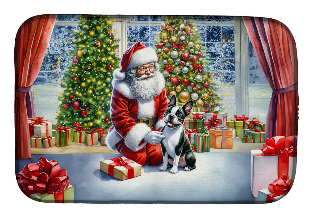 Dish Drying Mat featuring breed specific Boston Terrier artwork. Celebrate Christmas with this Christmas Dish Drying Mat. Say goodbye to messy countertops and soggy dish towels with our innovative dish drying mat. Our high-quality dish drying pad is designed to keep your countertops dry while offering a stylish and efficient solution. Whether you're air drying dishes, glasses, stemware, silverware, pots, pans, bottles, or even fruits and vegetables, our dish mat is the perfect choice. The 14 inches x 22 inches size fits most counters and dish drying racks, and the non-slip design ensures stability. Made with water-absorbent polyester and a polyurethane foam insert, our dish drying mat is not only functional but also durable. It's machine washable and printed in the USA for long-lasting use. The beautiful artwork adds flair to your kitchen decor, making it a perfect housewarming gift or present for any occasion. Upgrade your kitchen experience with our absorbent and versatile dish drying mat.