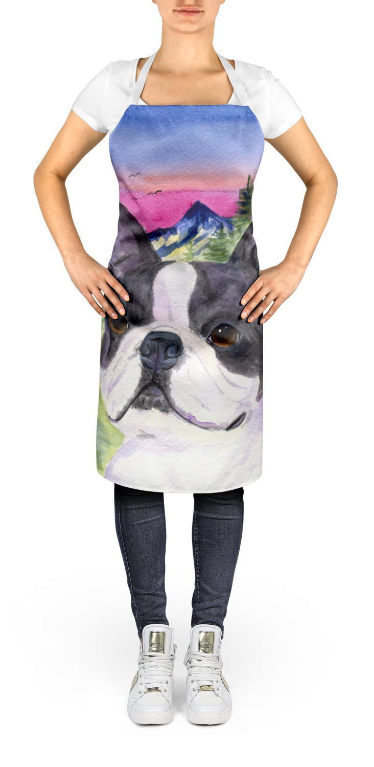 Decorate your space with our Boston Terrier artwork on a Apron. Elevate your cooking, baking, and grilling experiences with our versatile Kitchen or BBQ Apron. This Bib Style apron isn't just limited to culinary activities - it also serves as an excellent baking apron, artist apron, server apron, gardening apron, or even a dog grooming apron. The apron showcases vibrant full-color artwork contributed by one of our talented artists, bringing a dash of style to your daily tasks. With dimensions of approximately 27"W x 30"H, it provides ample coverage to protect your clothing from spills and splashes. Our apron is meticulously crafted from 100% Ultra Spun Polyester, known for its durability and lightweight nature. The apron comes with white tie straps, ensuring a comfortable and adjustable fit for all. It's a perfect choice for kitchen apron enthusiasts, whether you are a woman or a man. Designed for easy maintenance, this apron is fully machine washable. The quick-drying polyester material actively reduces staining, keeping your apron looking fresh and new for longer. Our beautifully designed apron isn't just a functional kitchen accessory - it's a fashion statement in the culinary world!