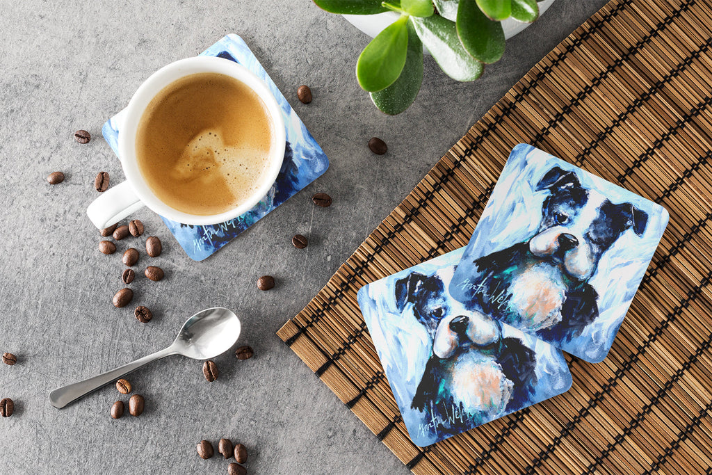 Decorate your space with our Boston Terrier artwork on a Coaster set. Presenting our Set of 4 Foam Coasters, a stylish and practical addition to your table setting. Each square coaster, measuring 3 1/2 inches by 3 1/2 inches, is perfectly sized to accommodate various drinkware, from coffee mugs to tumblers. These coasters stand out with their full-color artwork, permanently dyed onto the material for a vibrant and fade-resistant finish. They're not just functional, they're a fashionable statement, adding a touch of flair to any gathering or event. Our foam coasters serve a dual purpose - they protect your table from water stains and are perfect for both hot and cold drinks. The material used is similar to that of our high-quality mouse pads, ensuring durability and heat resistance. These coasters are easy to maintain - simply wash them in the top of your dishwasher and lay flat to dry. The design won't come off, ensuring they retain their vivid colors for years. Pair them with one of our insulated coolers or huggers for a cohesive, thoughtful gift set. Enhance your beverage experience with our Set of 4 Foam Coasters.