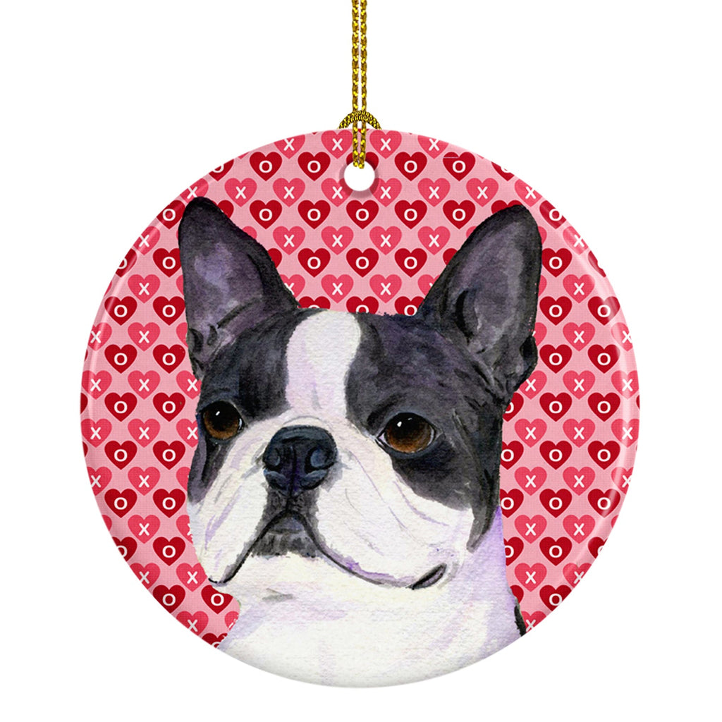 Decorate your space with our Valentine's Day Boston Terrier artwork on a Ornament. Add a touch of personalized charm to your Christmas tree this holiday season with our Ceramic Ornament. Measuring 2.8125 inches in diameter, this round porcelain ornament beautifully reflects your festive lights, enhancing your holiday decor. The gloss surface sets off the vibrant, full-color artwork contributed by one of our talented artists, bringing a pop of color and joy to your tree. This Ceramic Ornament doesn't stop at being merely decorative. The white back is designed for personalization. Write a heartfelt message, mark a special year, or inscribe a date with a paint pen or a permanent marker to create a treasured memento. Please ensure you allow any personalization to dry thoroughly before handling to maintain the pristine finish. Included with the ornament is a delicate gold cord for easy hanging. Made in the USA, this Ceramic Ornament makes an exceptional gift for a pet sitter, teacher, family member, or anyone you wish to share a little Christmas magic with. With its blend of style, charm, and personal touch, it's a meaningful addition to any Christmas tree.