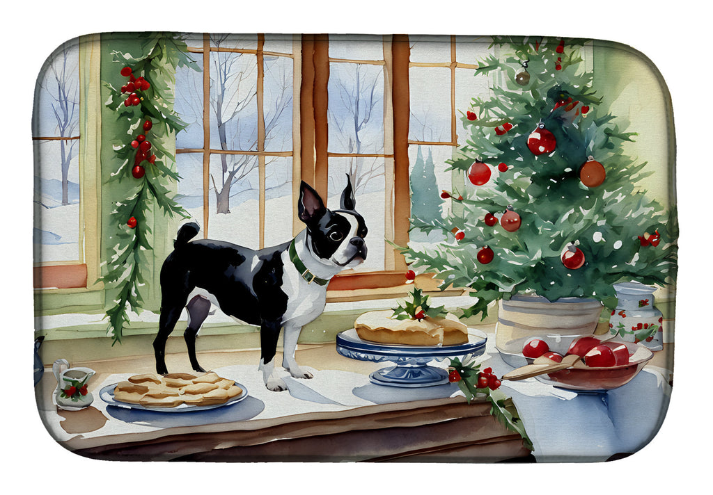Dish Drying Mat featuring breed specific Boston Terrier artwork. Celebrate Christmas with this Christmas Dish Drying Mat. Say goodbye to messy countertops and soggy dish towels with our innovative dish drying mat. Our high-quality dish drying pad is designed to keep your countertops dry while offering a stylish and efficient solution. Whether you're air drying dishes, glasses, stemware, silverware, pots, pans, bottles, or even fruits and vegetables, our dish mat is the perfect choice. The 14 inches x 22 inches size fits most counters and dish drying racks, and the non-slip design ensures stability. Made with water-absorbent polyester and a polyurethane foam insert, our dish drying mat is not only functional but also durable. It's machine washable and printed in the USA for long-lasting use. The beautiful artwork adds flair to your kitchen decor, making it a perfect housewarming gift or present for any occasion. Upgrade your kitchen experience with our absorbent and versatile dish drying mat.