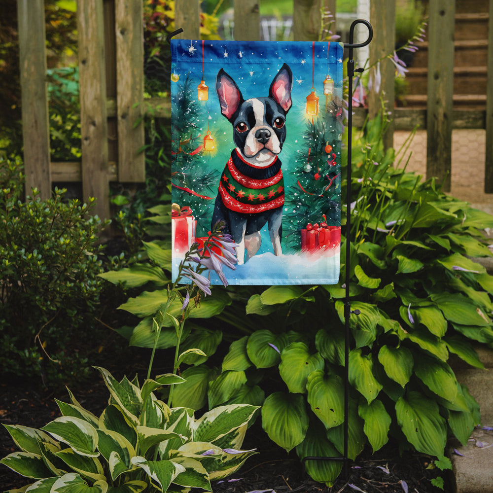 Decorate your space with our Christmas Boston Terrier artwork on a Garden Flag. Enhance the beauty of your garden, patio, or yard with Caroline's Treasures Decorative Garden Flag, proudly made in the USA. Crafted from two pieces of thick, double-sided polyester fabric, this 2-ply garden flag is designed to withstand various weather conditions, making it water-resistant and weatherproof. Featuring correctly readable words on both sides, this garden flag offers a delightful visual experience from any angle. With its heavier weight, it stands out among other garden flags, ensuring stability and durability even in wind, rain, and snow. Measuring approximately 11 1/4 inches by 15 1/2 inches, this flag allows you to personalize your outdoor decor. It comes with a 1 1/2-inch sleeve sewn in, allowing easy attachment to any standard garden flag stand or garden size porch hanger (sold separately). Make a statement in your outdoor space with Caroline's Treasures Decorative Garden Flag, a vibrant and high-quality flag that adds color and personality to your surroundings. Proudly made in the USA, it's a symbol of quality craftsmanship and attention to detail.