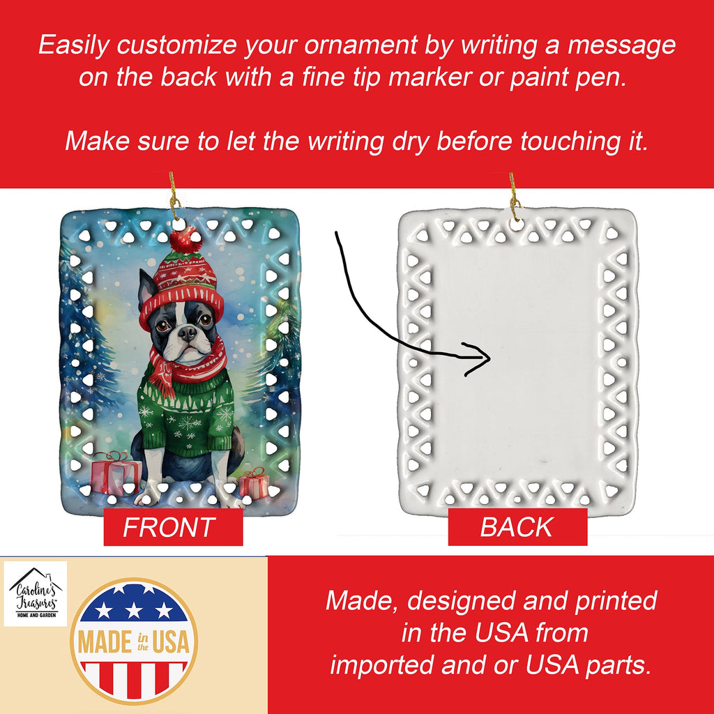 Porcelain Ornament featuring breed specific Boston Terrier artwork. Celebrate Christmas with this Christmas Ornament. Add a unique, personal touch to your holiday decor with our Rectangular Lattice Porcelain Ornament. Perfect for creating cherished memories, this high-quality ornament shines under festive lights, reflecting warmth and joy throughout your Christmas tree. Crafted with a glossy finish, it showcases vibrant, full-color artwork contributed by our talented artists, ensuring your tree is adorned with a burst of color and holiday spirit. What sets this Porcelain Ornament apart is its customizable white back. Use a paint pen or permanent marker to write a heartfelt message, commemorate a special year, or mark an unforgettable date, turning this ornament into a keepsake that will be treasured for years to come. For best results, allow any personalization to dry thoroughly before handling. Each ornament comes complete with a delicate gold cord, making it easy to hang and display. Proudly made in the USA, this ornament measures 3.375 x 2.625 inches and is a thoughtful gift for pet sitters, teachers, family members, or anyone who would appreciate a little extra holiday magic. Bring style, charm, and a touch of personal meaning to your Christmas tree with this beautifully designed ornament..