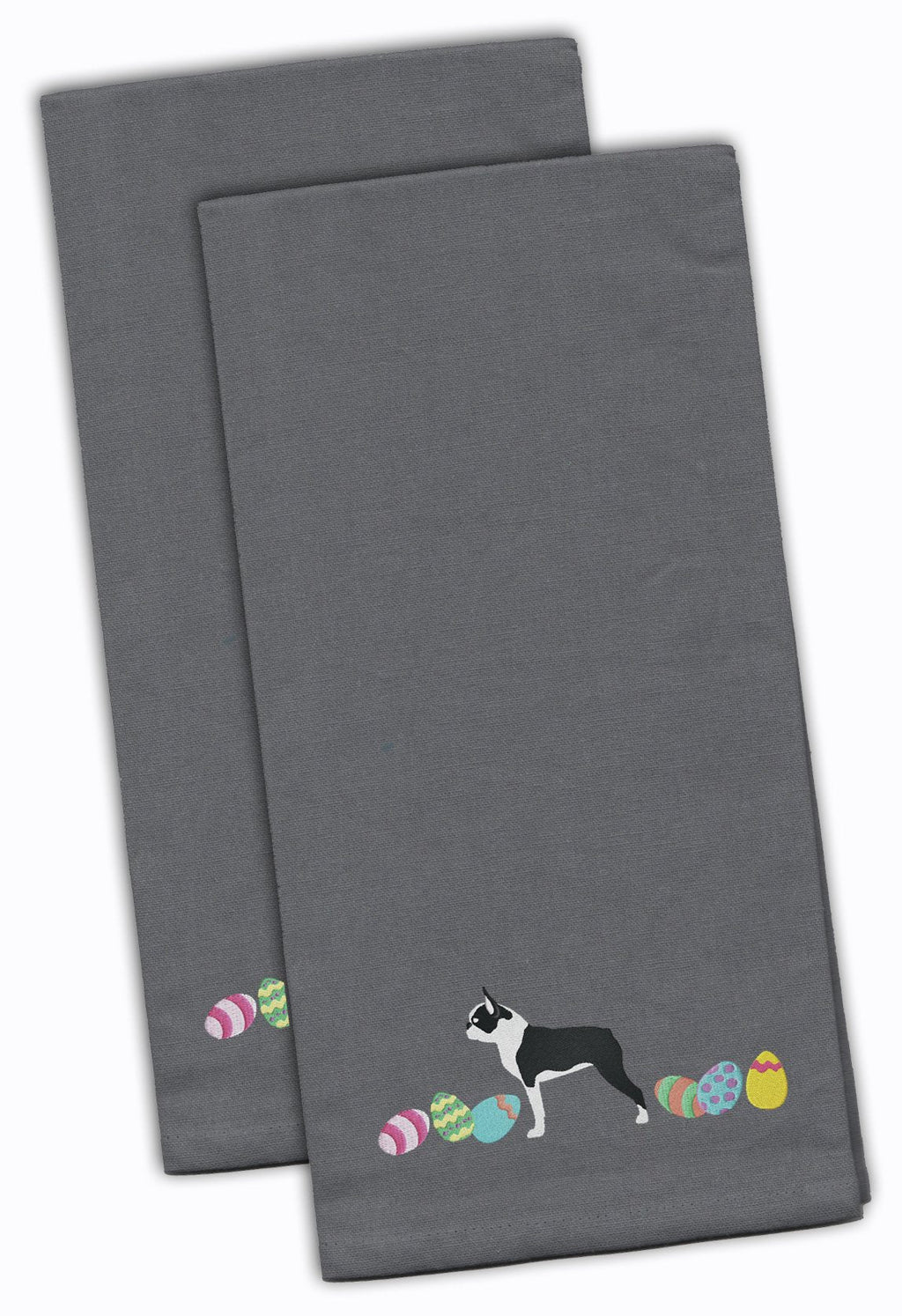 Decorate your space with our Easter Boston Terrier artwork on a Emboidered Towels. Discover the elegant touch your kitchen deserves with the Gray Embroidered Towel Set from Caroline's Treasures. This set includes two sophisticated kitchen towels, each meticulously crafted from 100% pure cotton, promising a soft touch and superior absorbency. These generously sized towels, each measuring 19 inches by 28 inches, offer ample coverage for all your drying needs._x000B__x000B_What sets this towel set apart is the exquisite embroidered design adorning each towel. It's not just a kitchen accessory; it's a statement of taste and style. These towels are perfect for daily use, and are easy to maintain. For the best care, machine wash in cold water and dry with low heat. When ironing, please ensure to use a pressing cloth to protect the integrity of the design._x000B__x000B_Experience a blend of functionality and fashion with the Gray Embroidered Towel Set from Caroline's Treasures. Elevate your kitchen d�cor and bring a touch of luxury to your everyday tasks with these high-quality towels.