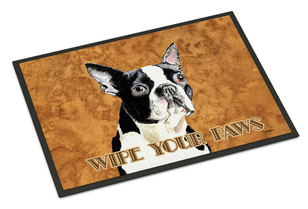 Decorate your space with our Boston Terrier artwork on a Doormat. Welcome your guests in style with our Artwork Door Mat, designed to withstand almost any weather condition. This mat, measuring approximately 24 by 36 inches, is held together by durable black binding tape. Its top layer, composed of polyester felt, is dyed with the eye-catching image you see on the mat. A few layers below provide the mat with stability, while its rubber bottom is stamped to help prevent slipping and ensures safety. Our mat works wonderfully as both an indoor or outdoor door mat. For cleaning, simply hose it off with water or use a power washer - no need for any cleaner that produces suds. Avoid scrubbing with a brush, instead, opt for the vacuum on floor setting. Designed manufactured and printed in the USA, this mat is a perfect addition to your porch, outdoor kitchen, entryway, or any indoor space. Its unique design makes it a charming decorative rug that greets your guests and adds a stylish touch to your home decor.