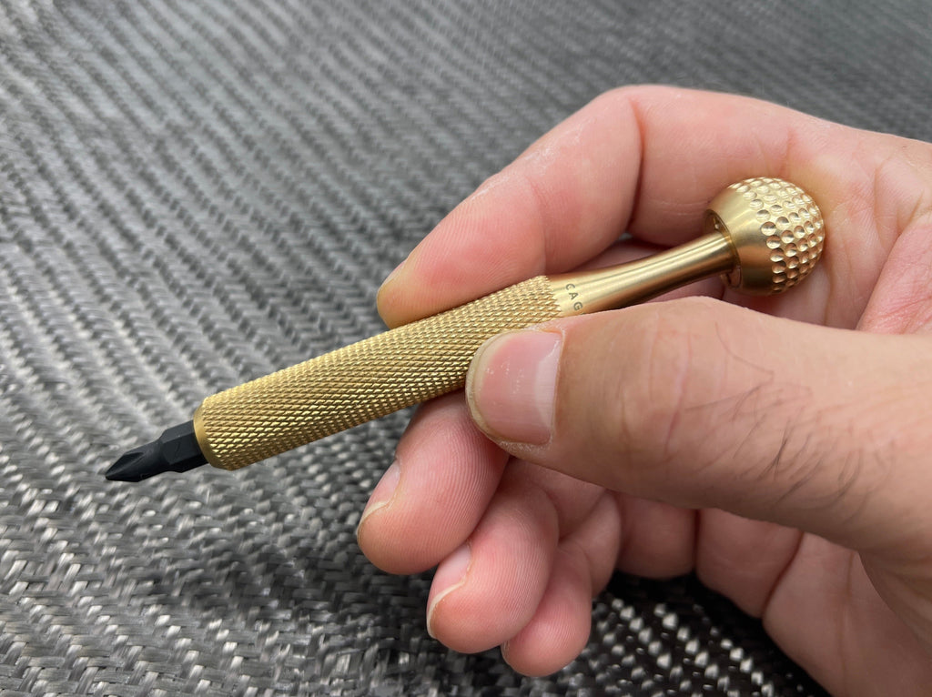 - Premium precision 1/4" drive Brass screwdriver with a knurled grip and a ball bearing concave swivel top.