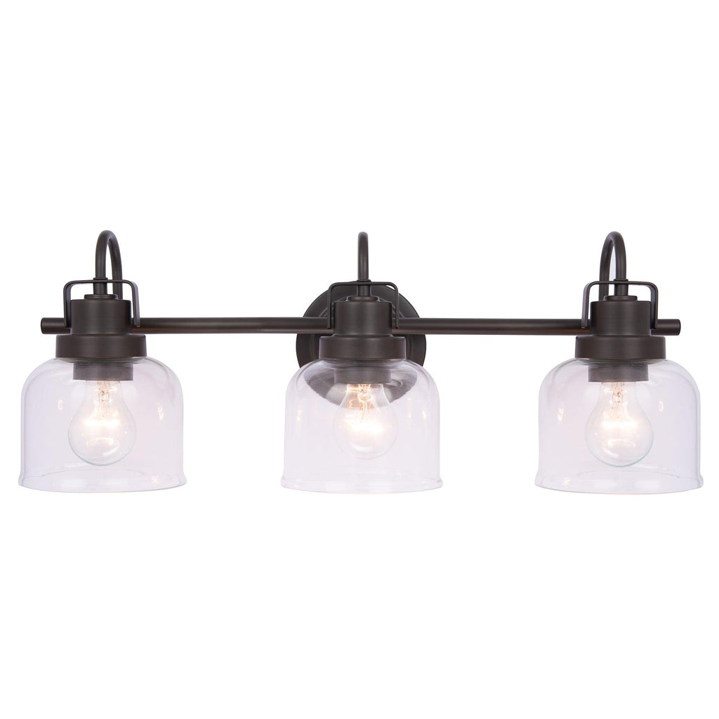 Black, 3-light vanity light displays a modern farm house look for the vanity. The backplate connects to one sleek arm that can easily be mounted up or down thanks to its reversible feature. Two clear glass cups enclose two medium-base bulbs up to 60W, which is not included. This vanity light is compatible with a dimmer switch (not included), so you can adjust the lighting to match what the room requires.