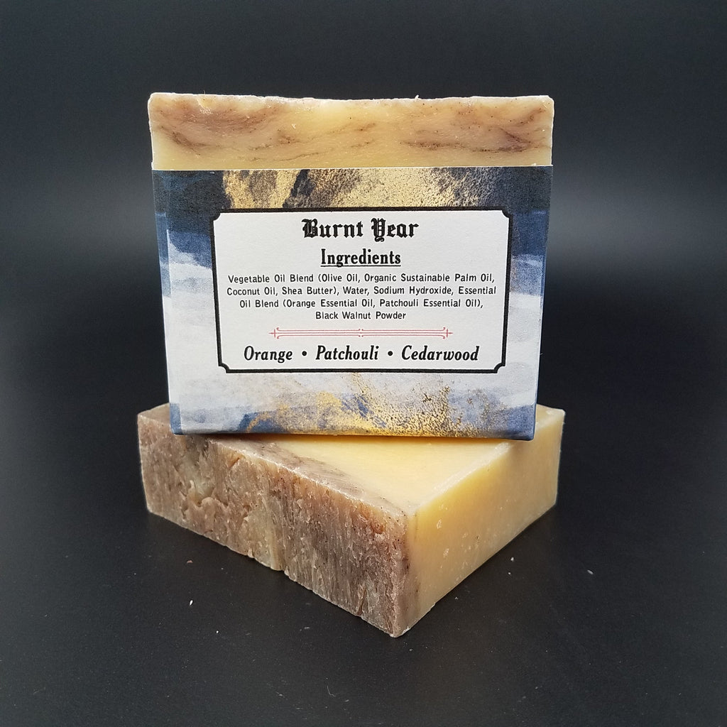 Saponified Oils (Olive Oil, Organic Palm Oil, Organic Coconut Oil, Organic Shea Butter), Orange Essential Oil, Patchouli Essential Oil, Black Walnut Powder