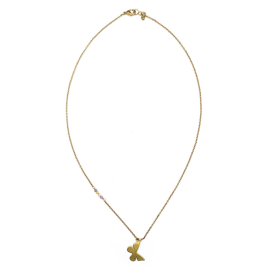 A necklace as soft and understated as the butterfly that graces it. The asymmetrical faceted glass beads add a small pop of subtle color. This necklace is handmade in our India sanctuary and is made from finished brass and glass beads. This ethically handmade necklace tells the world that you stand for freedom because your purchase gives back to young women escaping human trafficking. Every piece has a PURPOSE! 21" chain finished brass, faceted glass beads lobster clasp Sustainably handcrafted by artisans escaping human trafficking 100% of proceeds go to our non-profit, International Sanctuary, to provide each artisan with fair wages, education & holistic care
