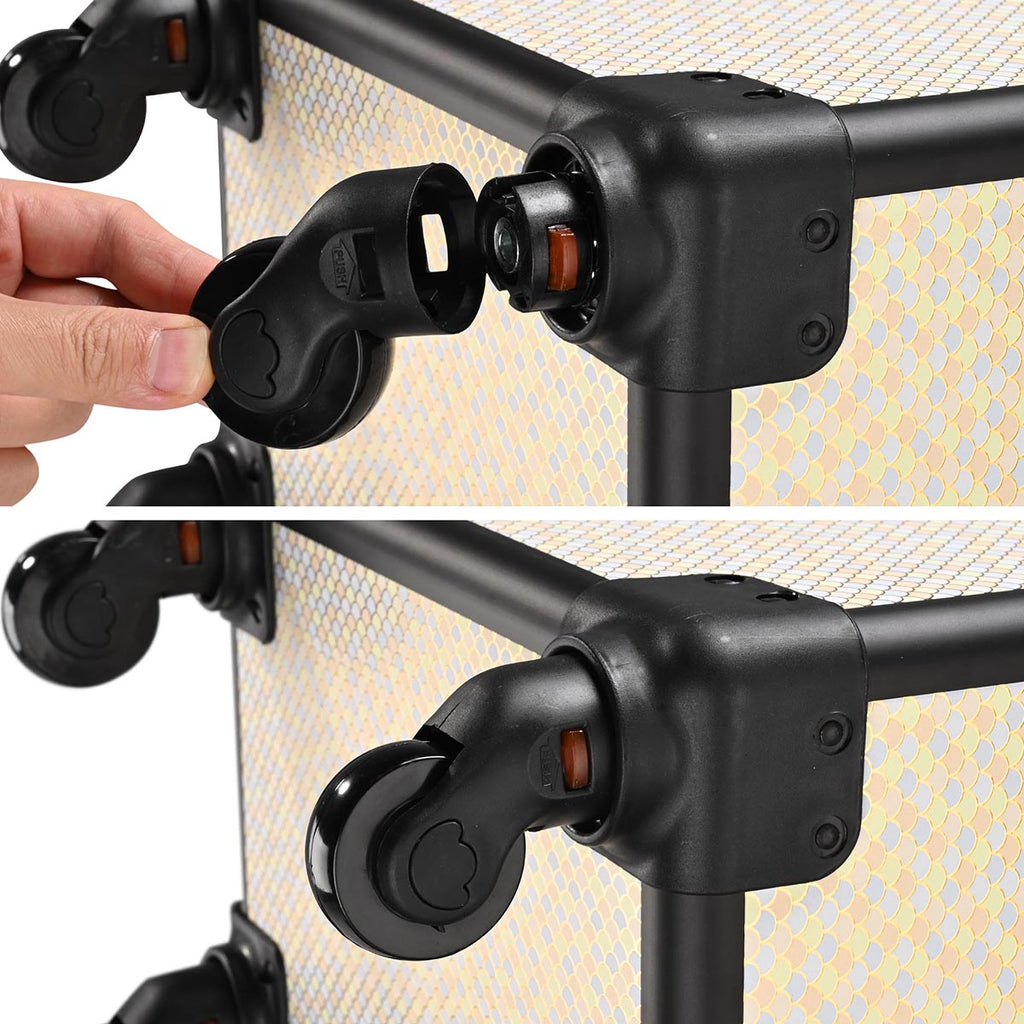 - Cosmetology Case on Wheels - 360-degree rotating, detachable wheels offer superior maneuverability and quiet transport. Navigate bustling backstage areas and crowded airports with graceful ease. Simply press the buttons and detach the wheels for compact storage and replacement