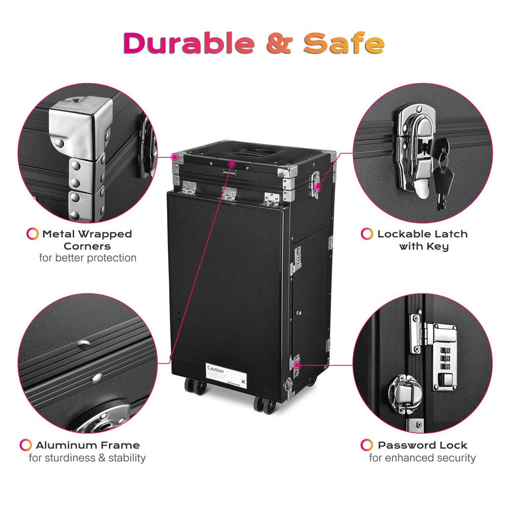 - Sturdy aluminum frame & metal-wrapped corners for durability; lockable latches to keep your items secure