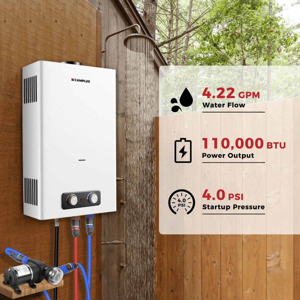 Camplux 4.22 GPM On Demand Water Heater, with 3.3 GPM Water Pump & Pipe Strainer