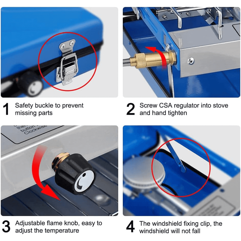 - Wind-blocking Shields - Camping gas stove with wind-blocking shields you could use outdoor cooking even if it's windy suddenly, without any disruption whatsoever