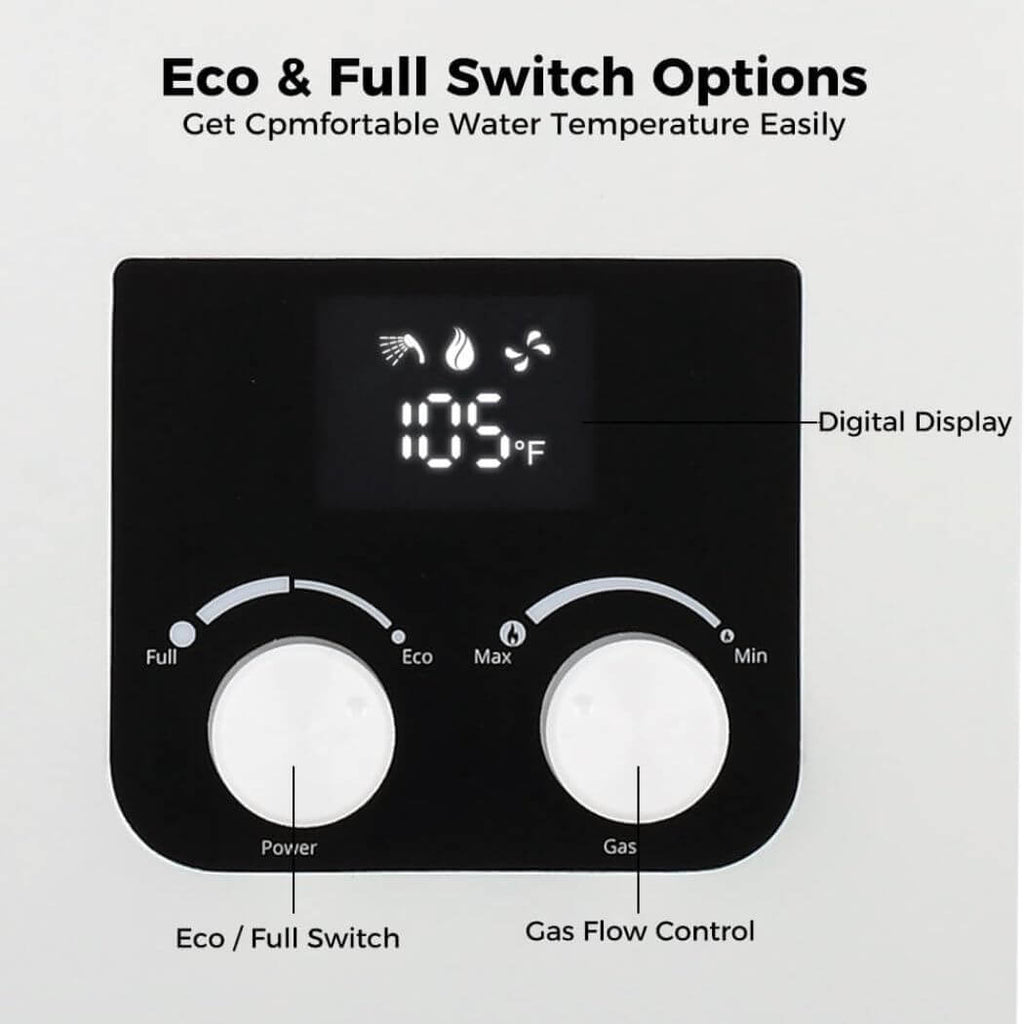 • Compact Design, Energy saving -The compact size instant hot water heater saves more space than traditional tanks.Trendy and modern design with Fahrenheit digital temperature display. Eco and Full gas switch for energy saving and get ideal hot water temperature.