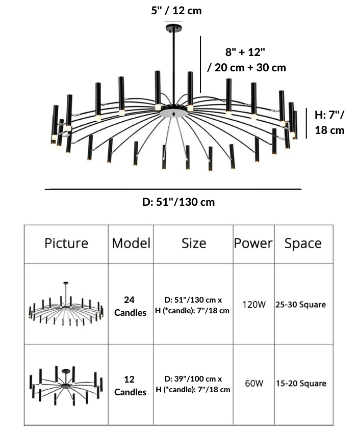 12 Candles: Diameter: 39'' / 100 cm x Height of Candle: 7'' / 18 cm.