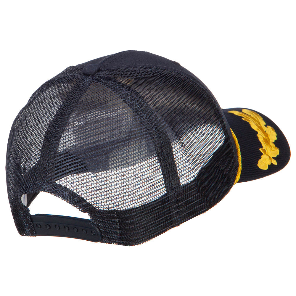 Embroidery Details, Captain trucker cap with oak leaf embroidered on bill.