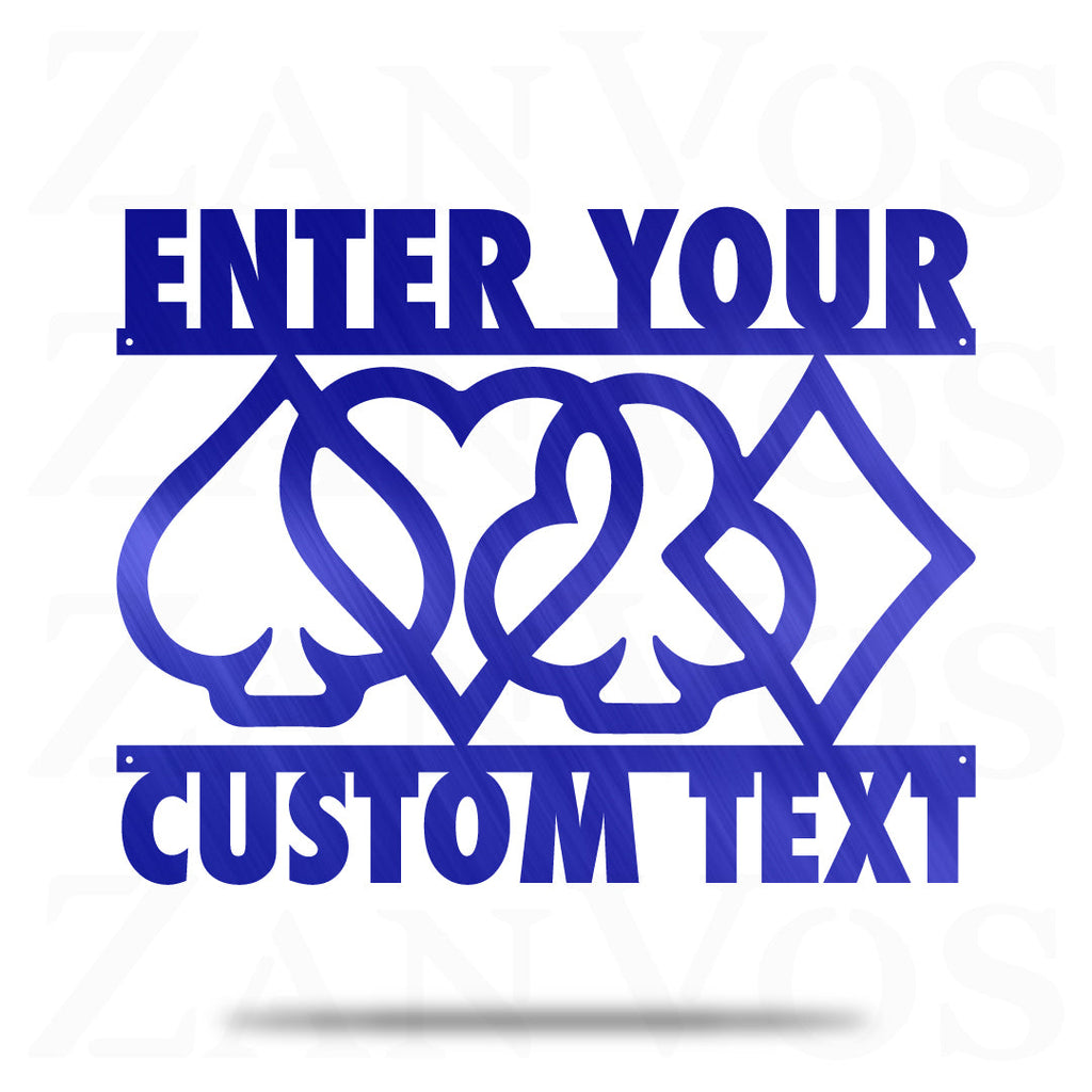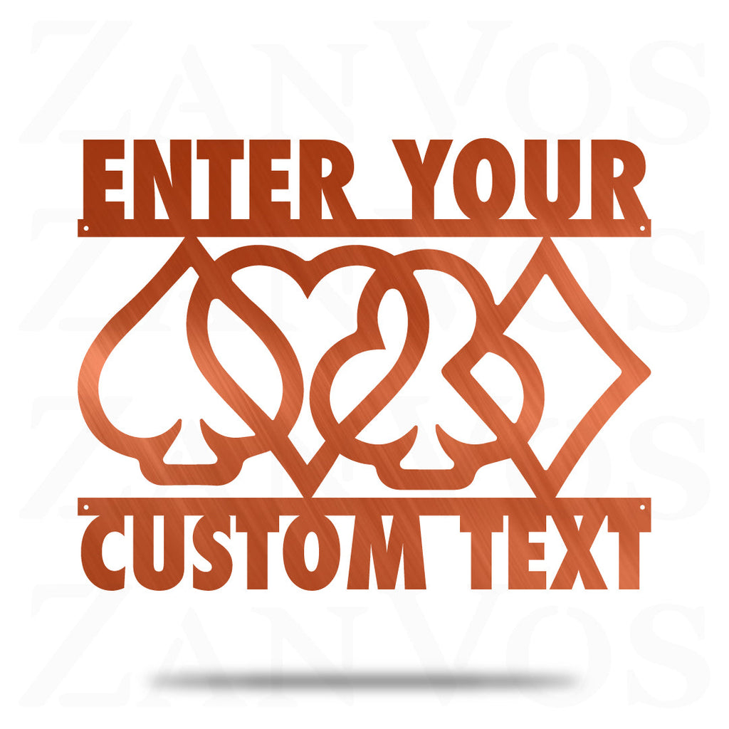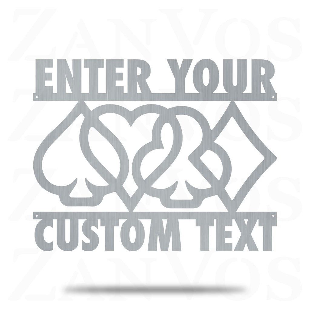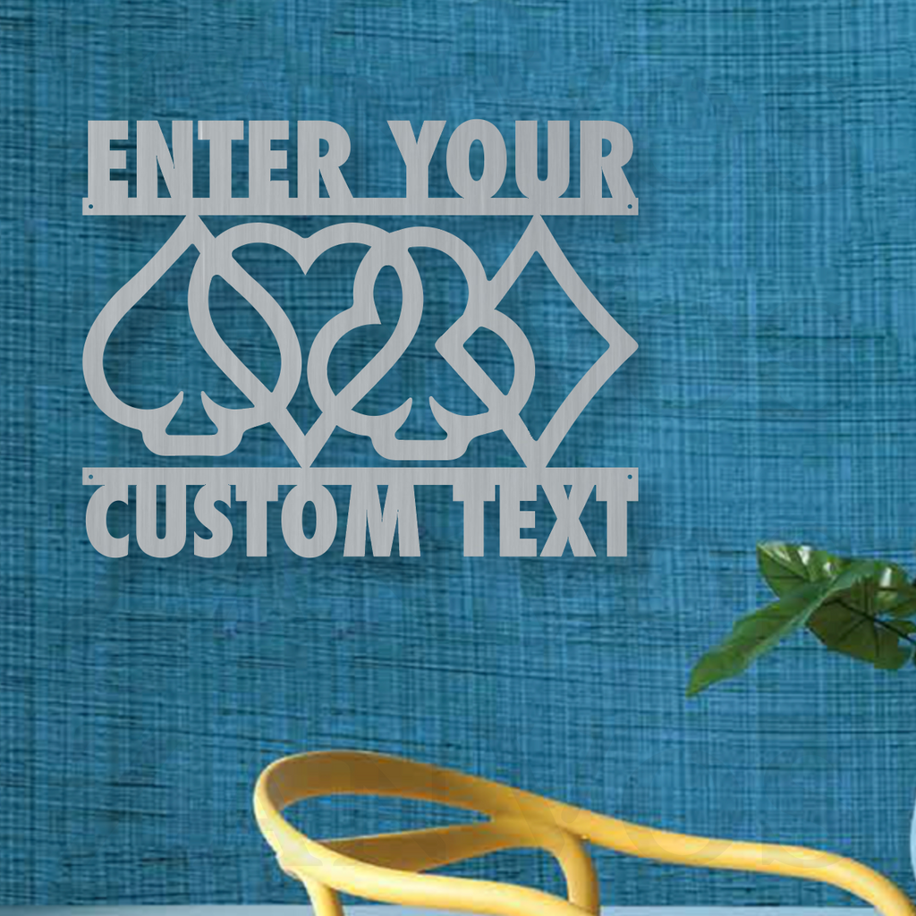 As long as you’ve got a chip and a chair, there’s still hope. Customize the Card Suits Monogram with your personalized text, color and size. Custom built by you and built to last. Our metal art is made out of 16 gauge steel and powder coated to endure the elements.