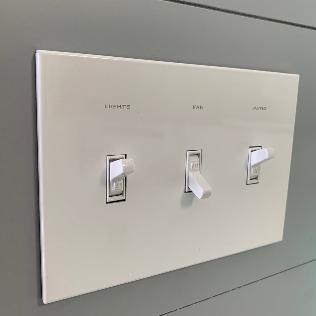 What makes the CleanPlate Classic different from other covers, is the CleanPlate Classic can be custom laser engraved to identify what a switch operates, eliminating the confusion of what turns on what.  Additionally the Cleanplate Classic is easily removed and replaced for cleaning, painting, maintenance, etc.,  by the use of high-powered rare earth magnets.